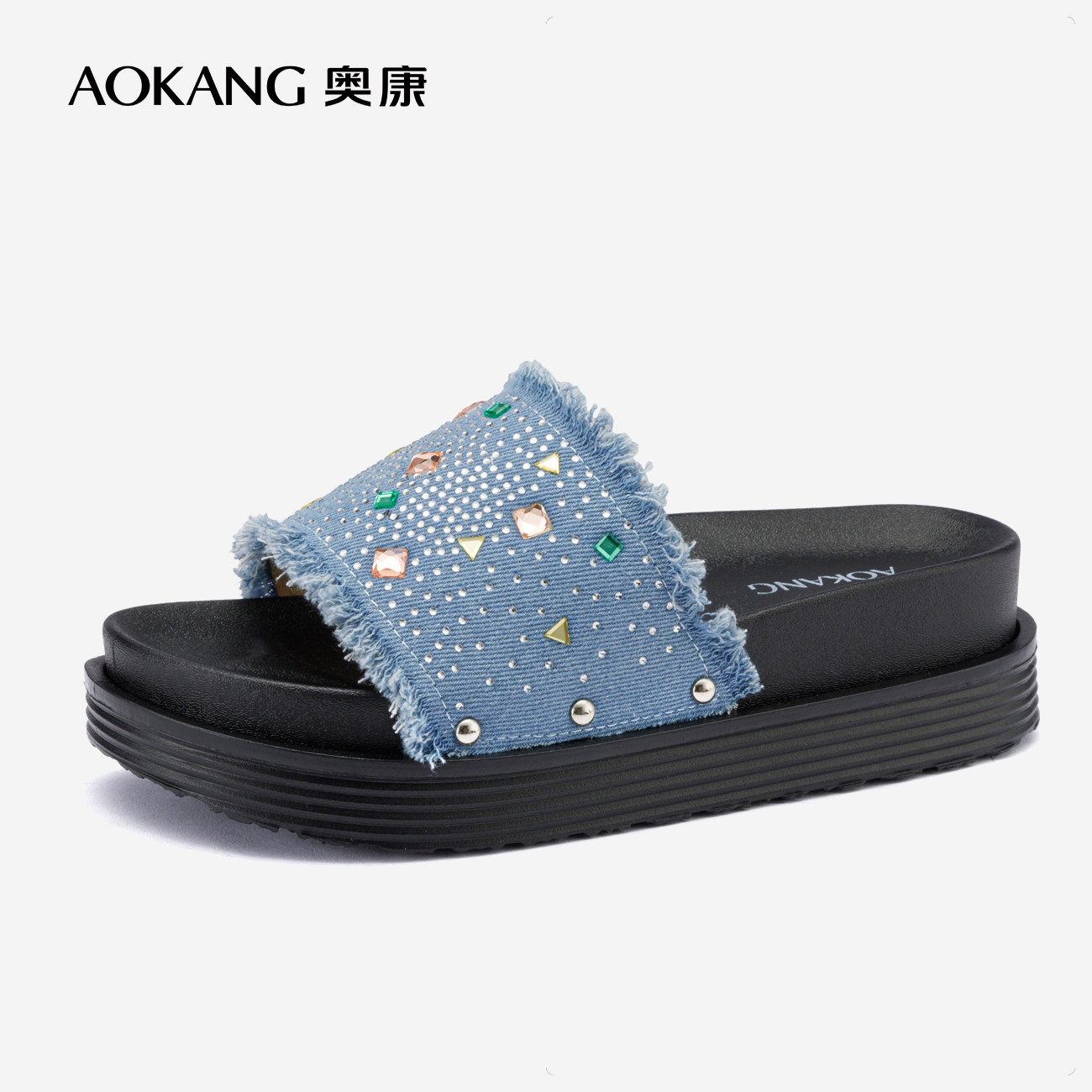 天猫【增高5CM】奥康女鞋夏季新款帆布牛仔露趾凉拖鞋时尚户外厚底拖