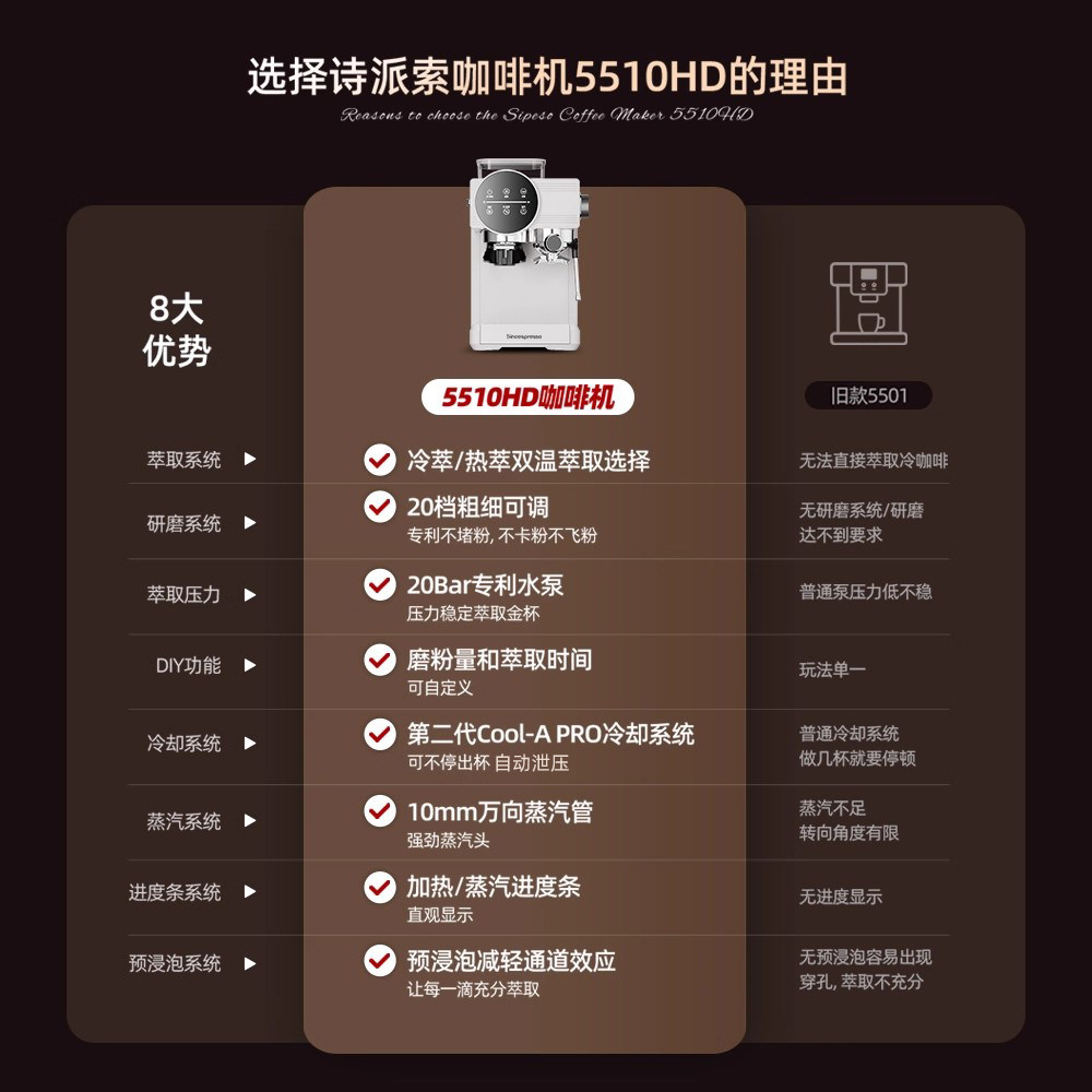 【新年礼物】诗派索咖啡机家用小型意式半自动冷热双萃研磨一体机,集研磨、萃取、冷热饮制作于一体,轻松满足全家人的咖啡需求。采用高精度锥形磨豆系统,现磨现萃,保留咖啡豆原始香气;支持意式浓缩与冷萃双重模式,无论是香浓热拿铁还是清爽冰美式,一键即享。小巧机身设计,节省厨房空间,操作简便,适合新手与咖啡爱好者。配备可拆卸水箱与易清洁结构,日常维护轻松便捷。新年送上一台诗派索咖啡机,不仅是一份贴心好礼,更是开启品质生活的仪式感,让每一天都从一杯专业级咖啡开始。