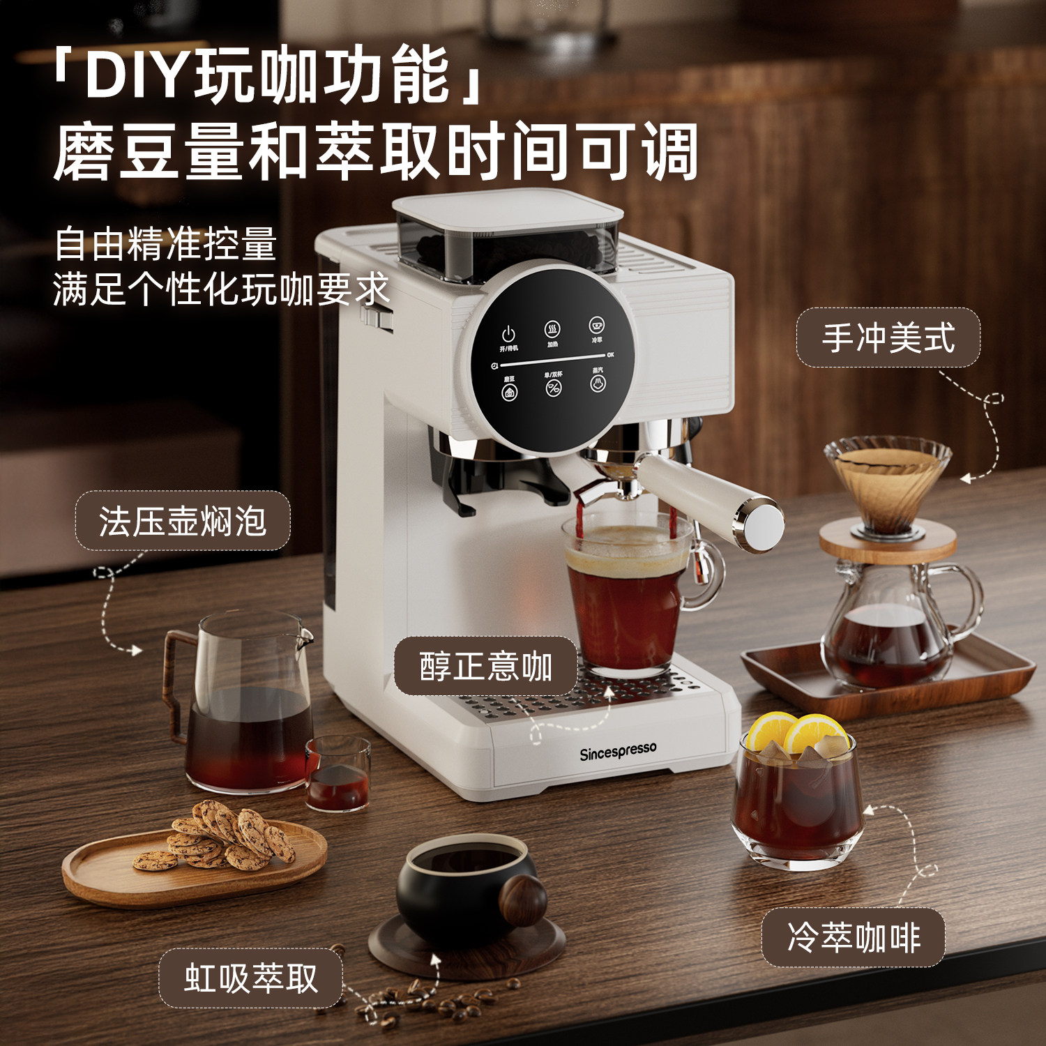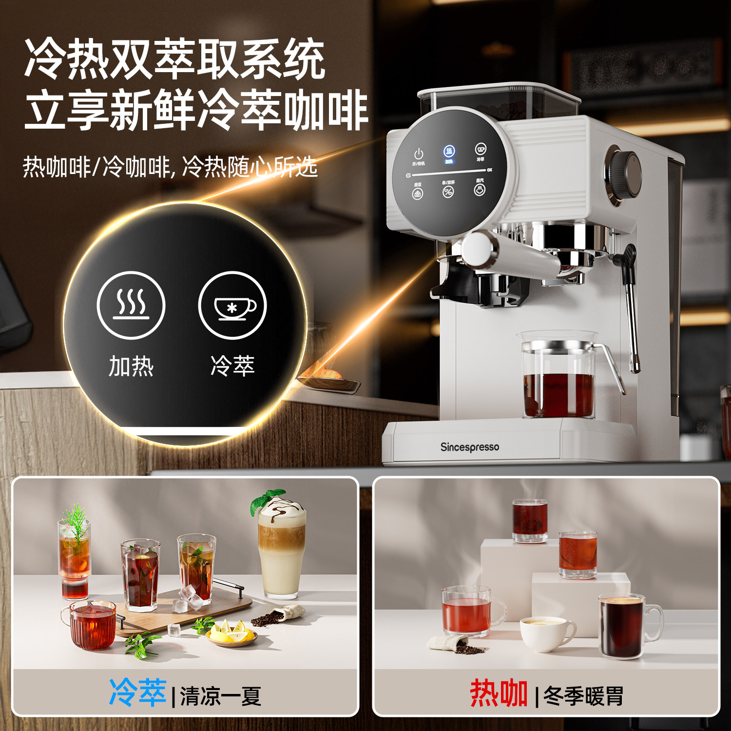 天猫Sincespresso诗派索咖啡机家用意式半自动研磨豆一体机冷热双萃