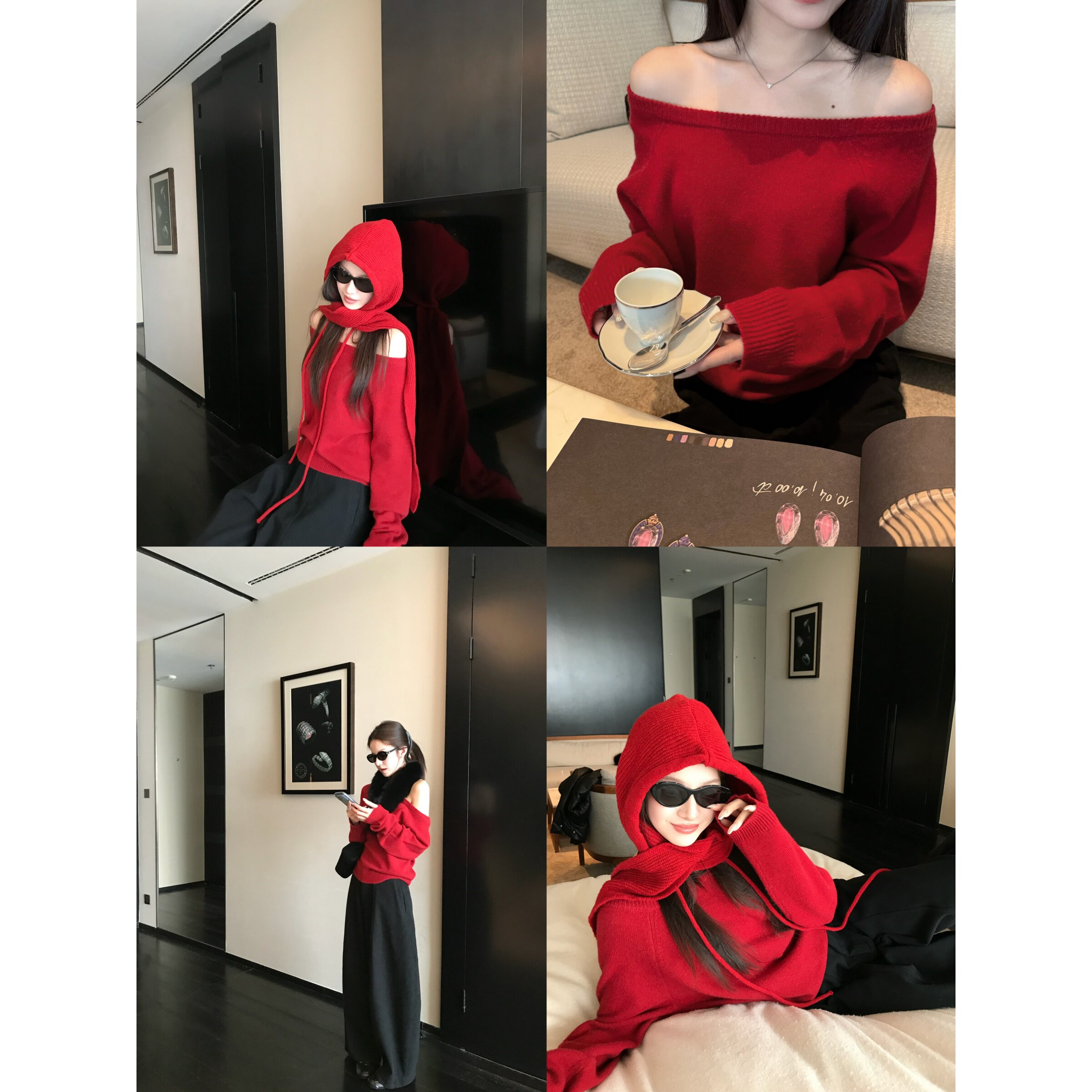 淘宝superniniyy节日唯美氛围感100羊毛一字肩斜肩正红色显白显瘦毛衣