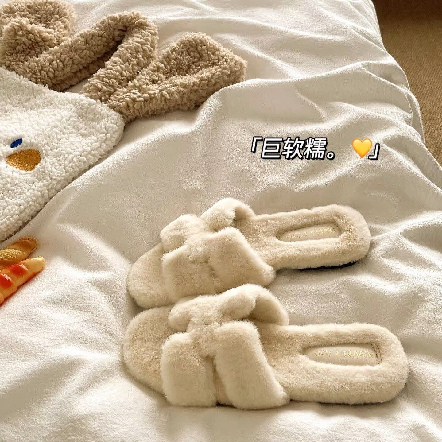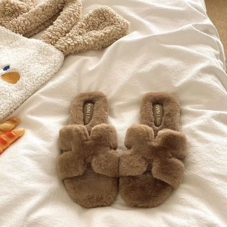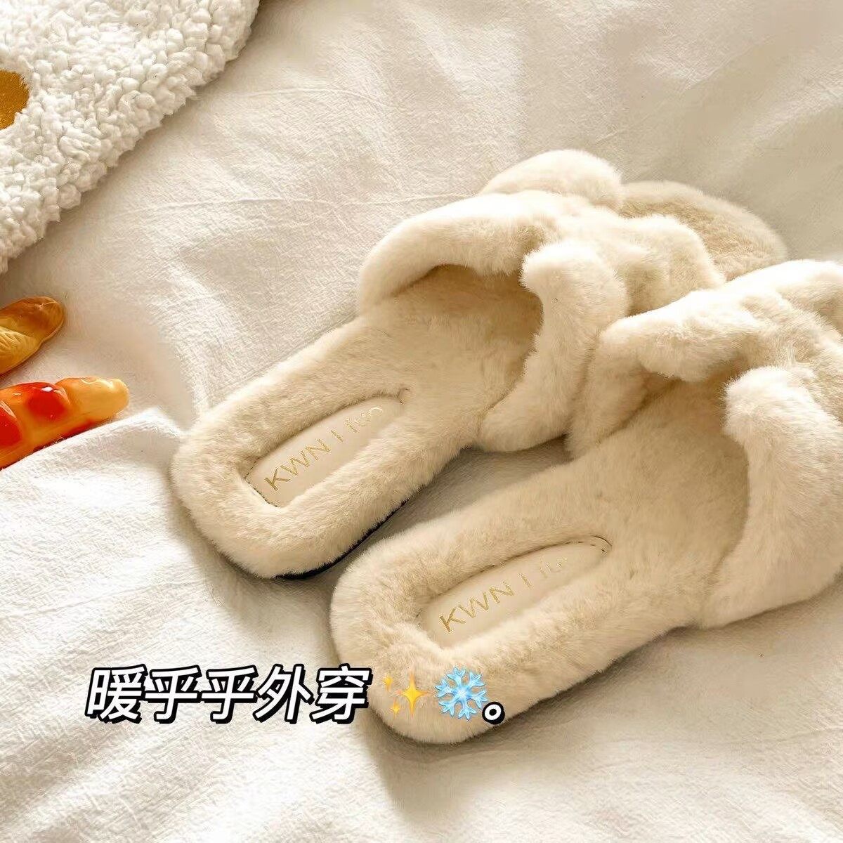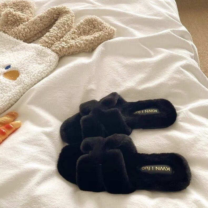 淘宝法式平底毛毛拖鞋女外穿2025新款秋冬季平底毛茸茸慵懒一字棉拖鞋
