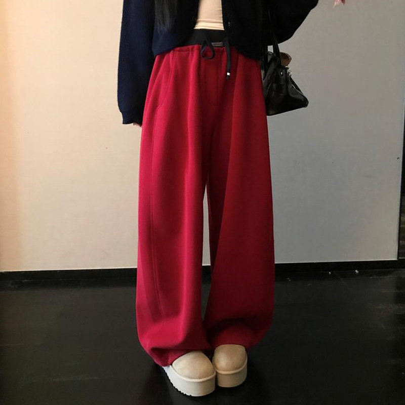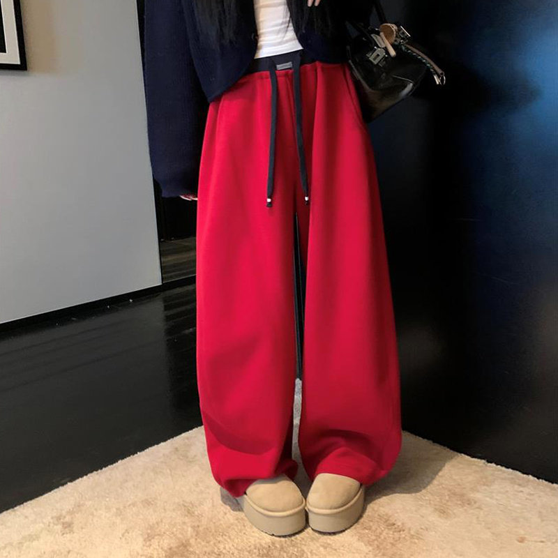 韩系弯刀镰刀裤直筒阔腿裤红色卫裤宽松运动休闲裤女秋冬加绒加厚