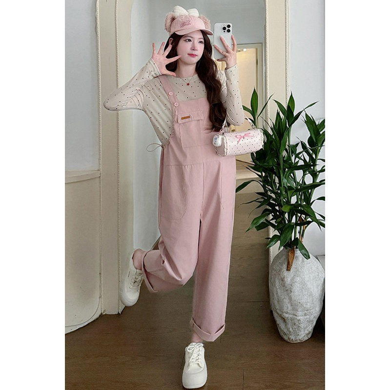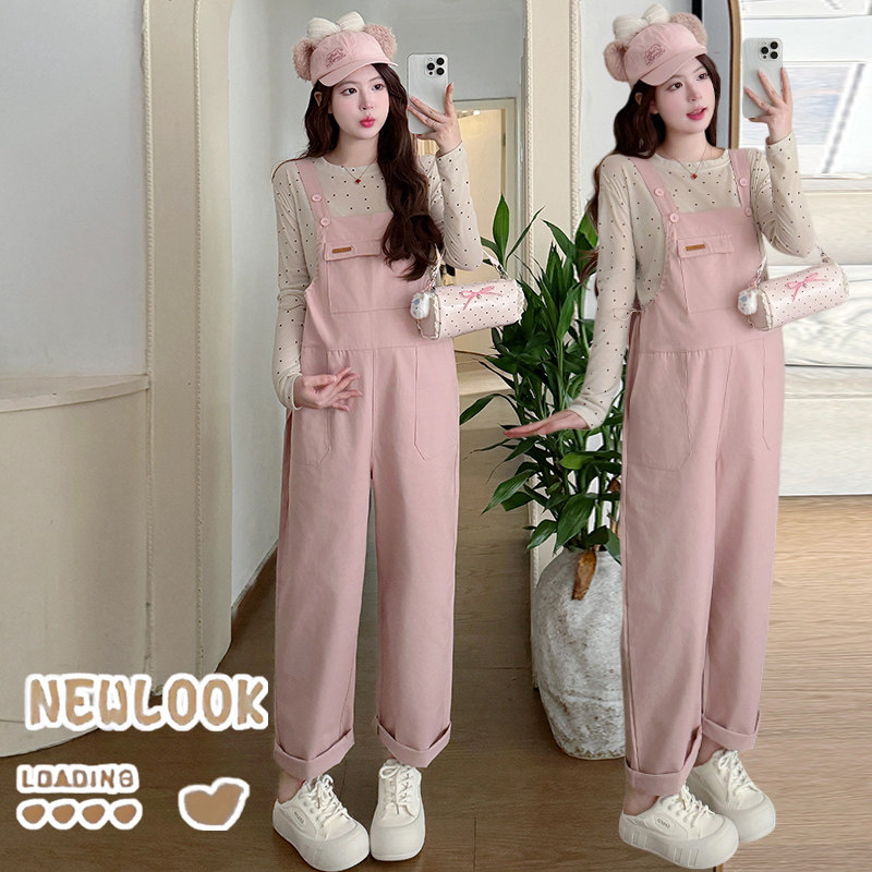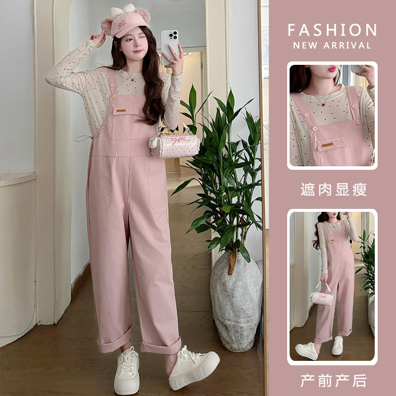 淘宝孕妇套装春秋2026新款韩版休闲简约牛仔背带裤波点上衣套装百搭女