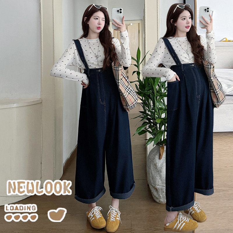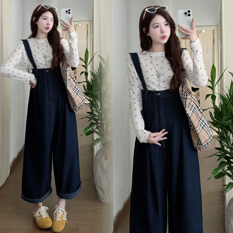 天猫孕妇套装春秋2026新款休闲简约韩版宽松潮妈蓝色牛仔背带裤两件套