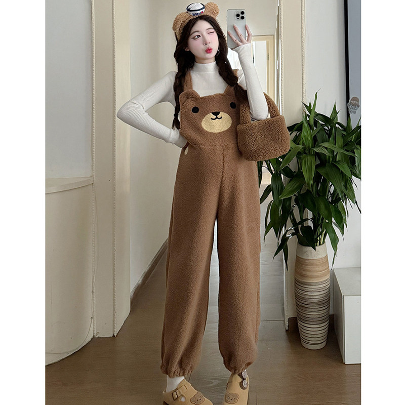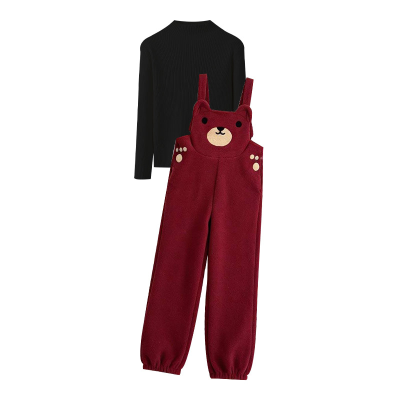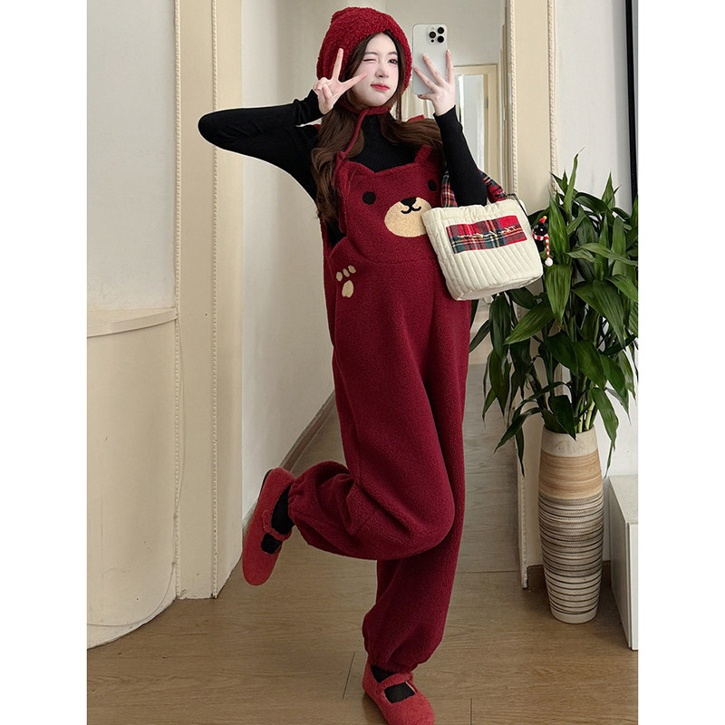 淘宝孕妇套装秋冬季2026新款过年红加绒加厚羊羔毛背带裤打底衫两件套