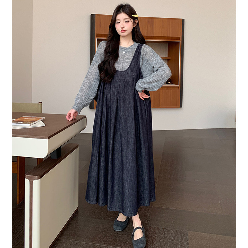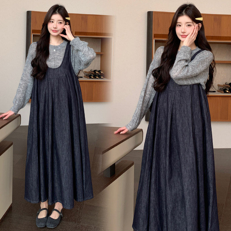 时尚大码孕妇装2025年秋冬季新品背带孕妇连衣裙+毛衣两件套洋气