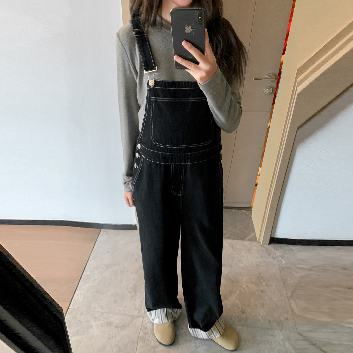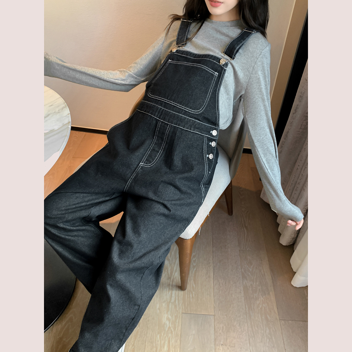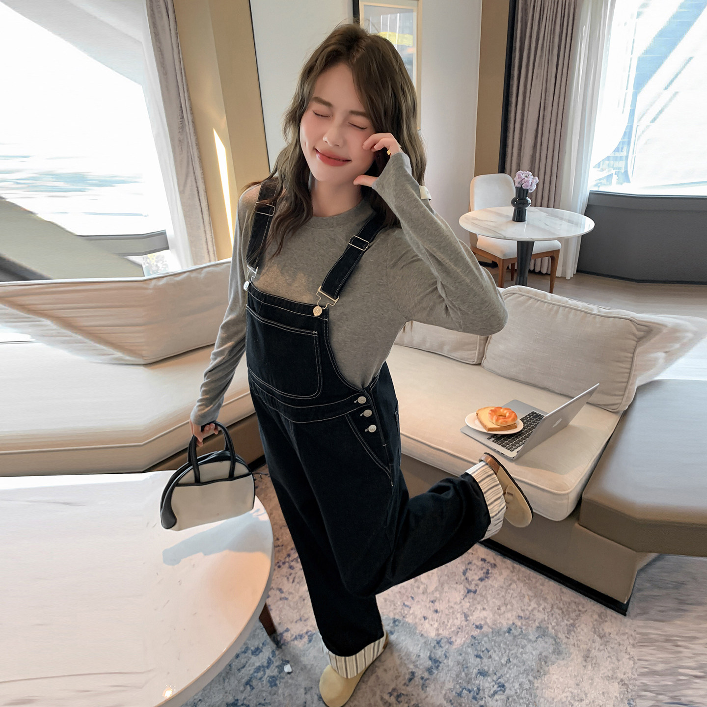 淘宝◆诺初◆孕妇秋装显瘦减齡口袋背带裤复古宽松阔腿裤折边牛仔裤