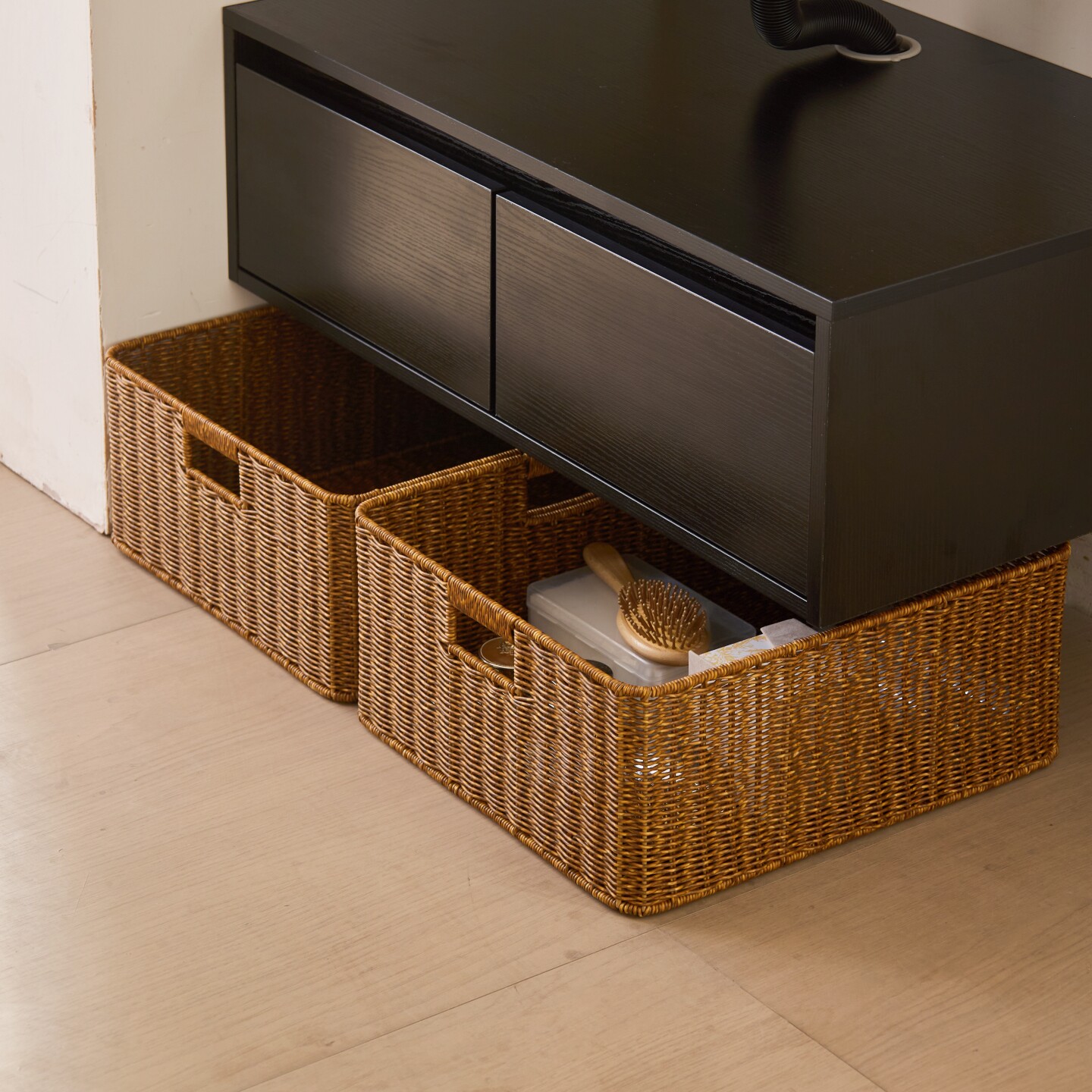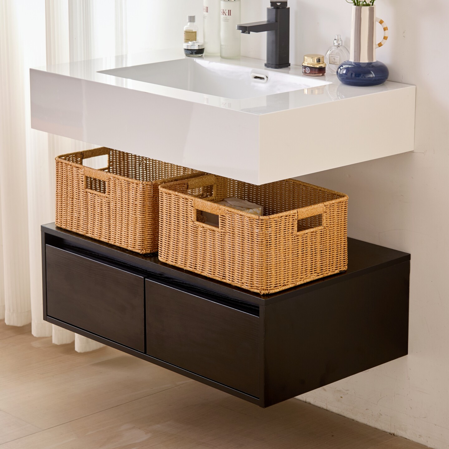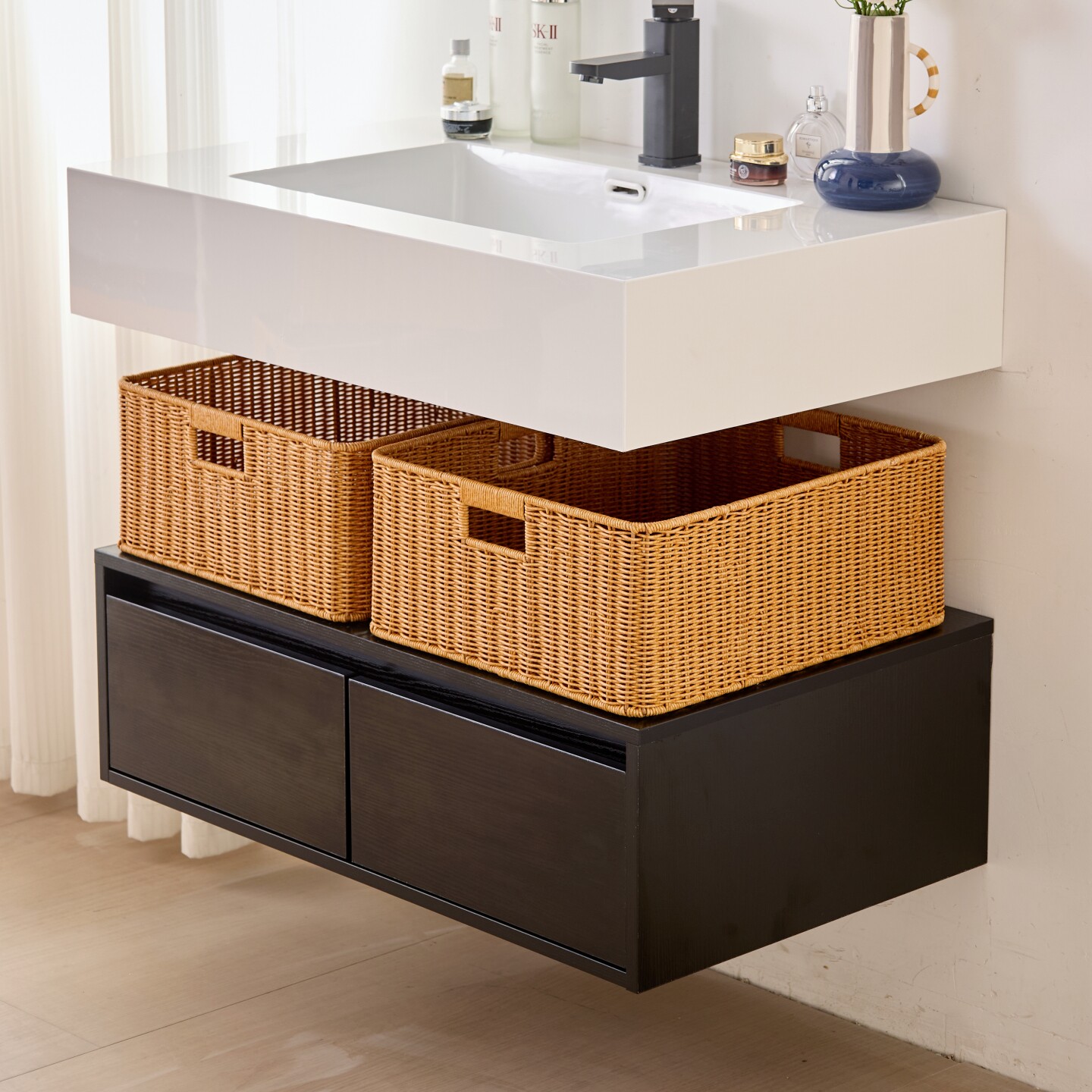 这款浴室柜下编织收纳筐采用仿藤编设计,外观自然雅致,完美融入现代卫浴空间。精选防水环保材质,防潮防霉,经久耐用,特别适合潮湿的卫生间环境。巧妙利用浴室柜下方空间,有效遮挡杂乱的下水管,提升整体美观度。筐体结构稳固,容量适中,可轻松收纳浴巾、毛巾、洗护用品等日常物品,保持台面整洁。底部镂空设计利于通风透气,避免积水滋生细菌。安装简便,无需打孔,适配多数标准浴室柜尺寸。兼具实用性与装饰性,是提升浴室收纳效率的理想之选,让狭小空间也能井然有序、清爽宜人。