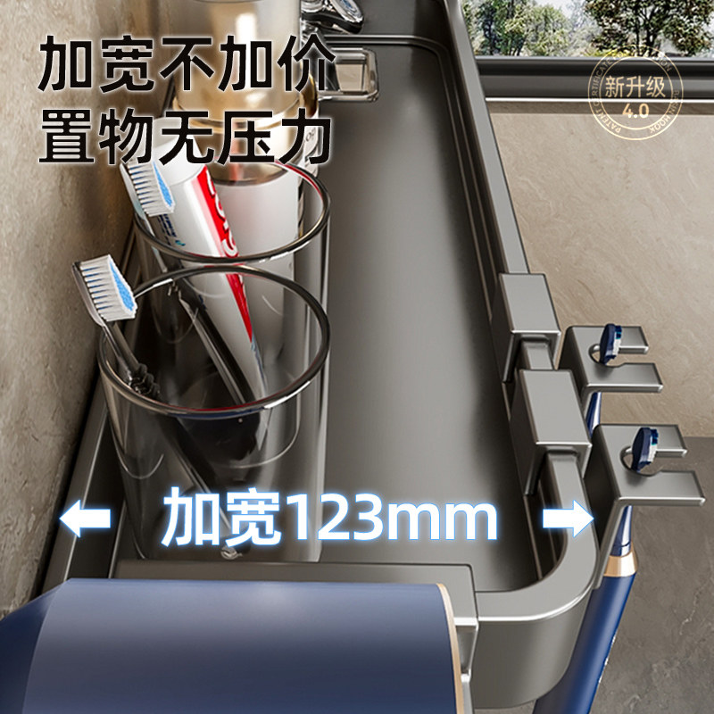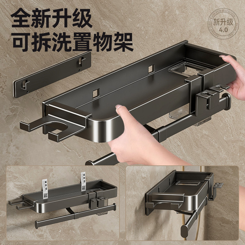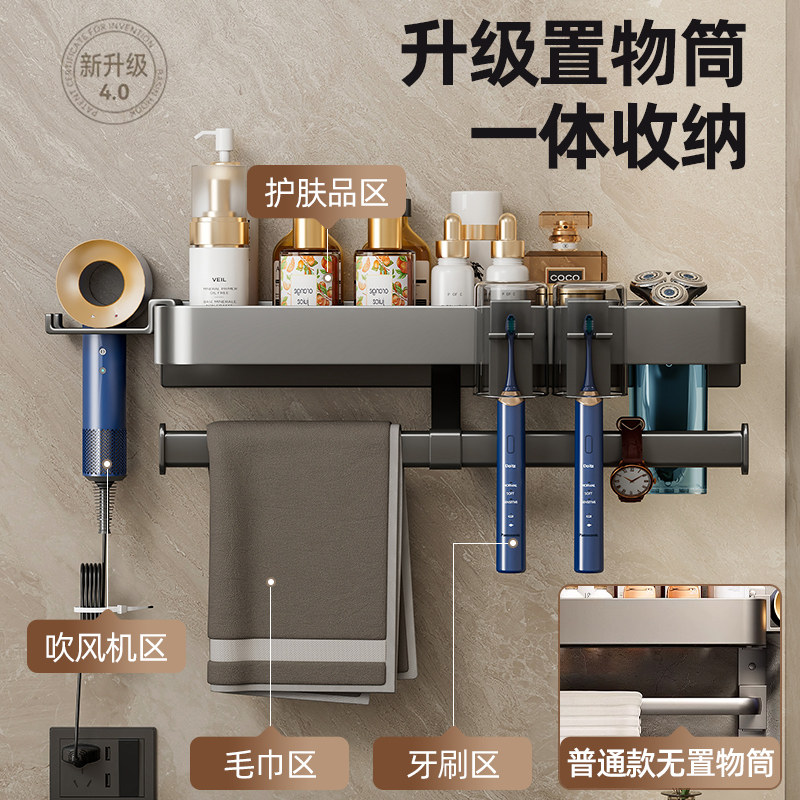 天猫枪灰卫生间置物架浴室毛巾架免打孔壁挂厕所吹风机一体牙刷洗漱台