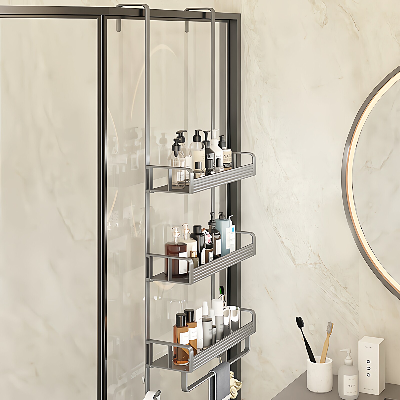 这款三层浴室置物架采用优质不锈钢与钢化玻璃设计,专为淋浴房或玻璃门打造,悬挂式安装无需打孔,稳固承重且防潮防锈。三层大容量分层收纳,可整齐摆放沐浴露、洗发水、香皂、毛巾等洗浴用品,充分利用垂直空间,保持浴室整洁有序。透明钢化玻璃层板通透美观,易清洁不留水渍,搭配防滑边框设计,安全实用。适用于各种玻璃门厚度,安装简便,是提升卫生间收纳效率的理想之选,让沐浴空间更清爽便捷。