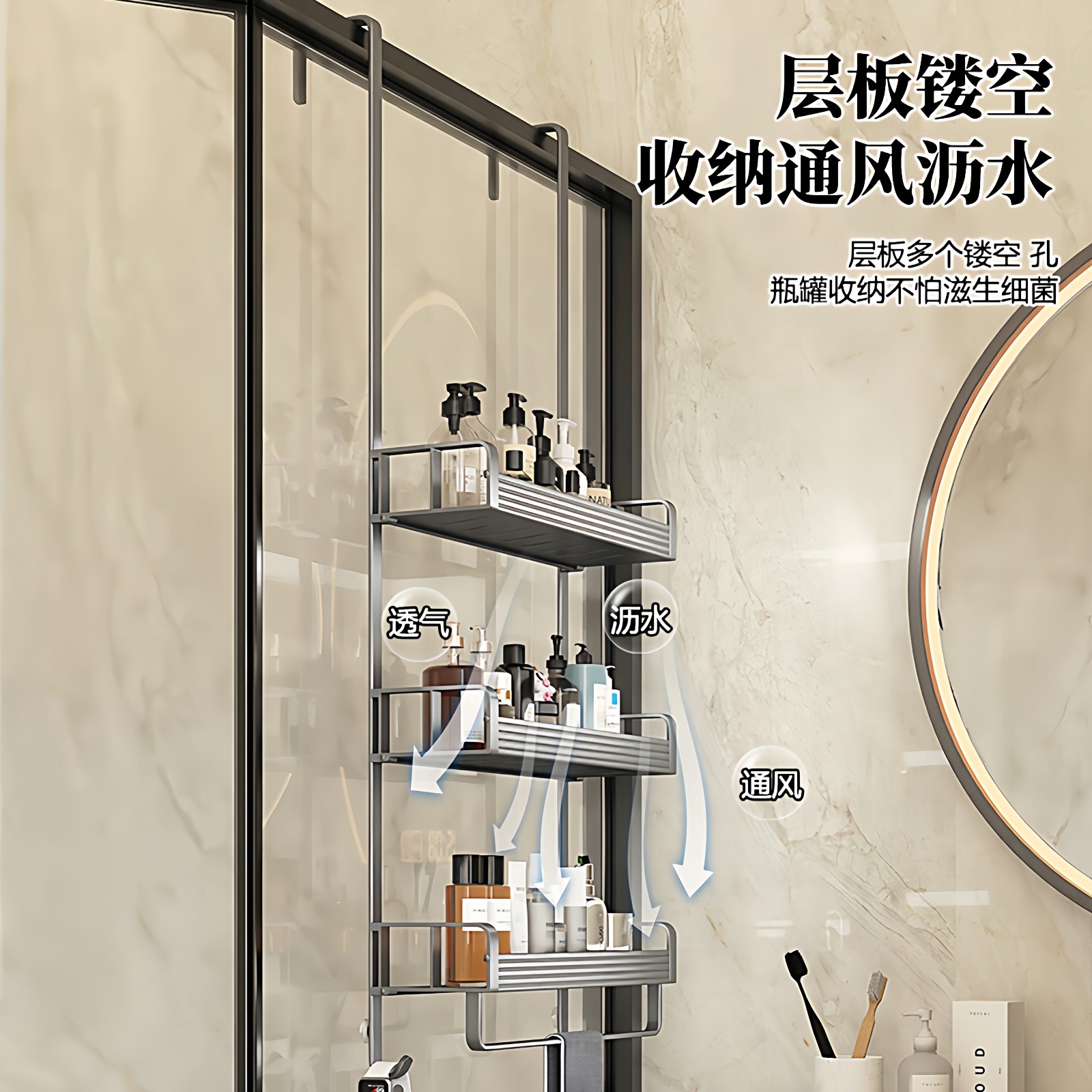 天猫浴室置物架玻璃门收纳挂架 卫生间三层淋浴房放沐浴露挂篮悬挂式