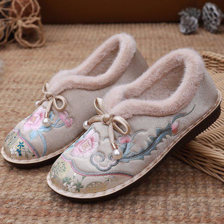 冬季加绒手工包头兔毛虎头棉拖鞋女古风保暖老北京中式绣花布拖鞋