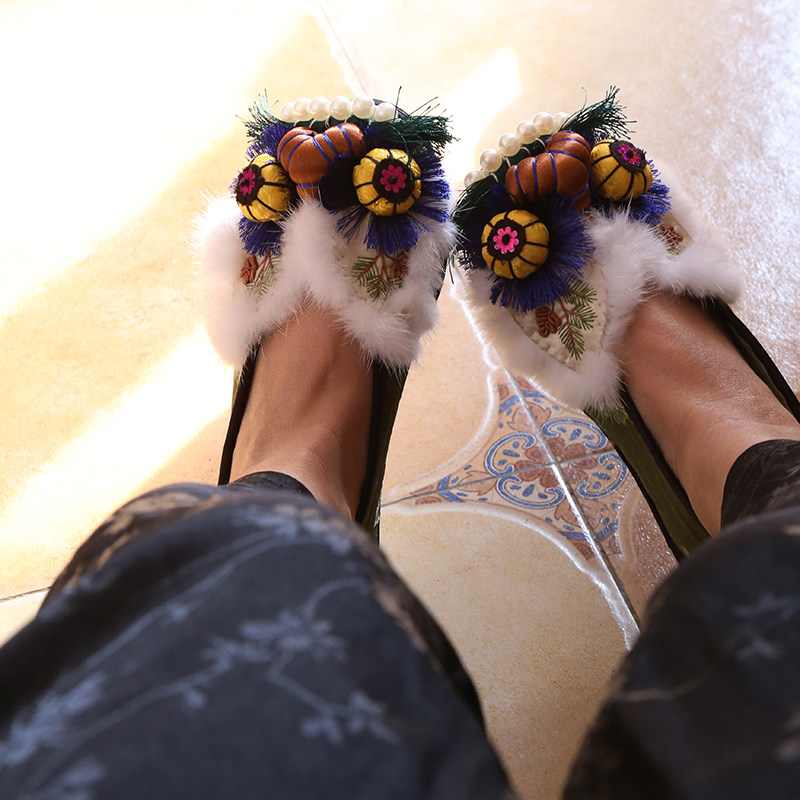 冬季加绒手工包头兔毛虎头棉拖鞋女古风保暖老北京中式绣花布拖鞋