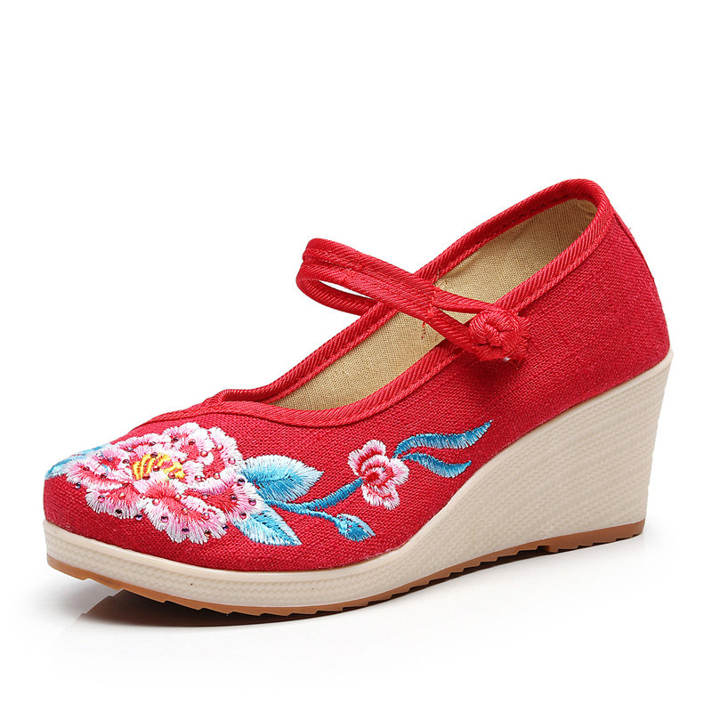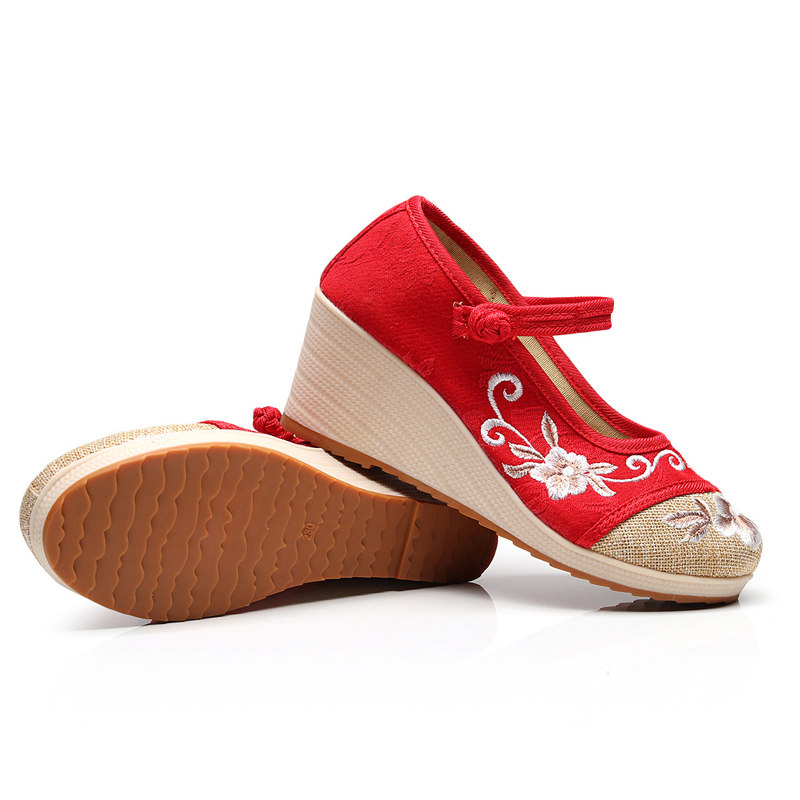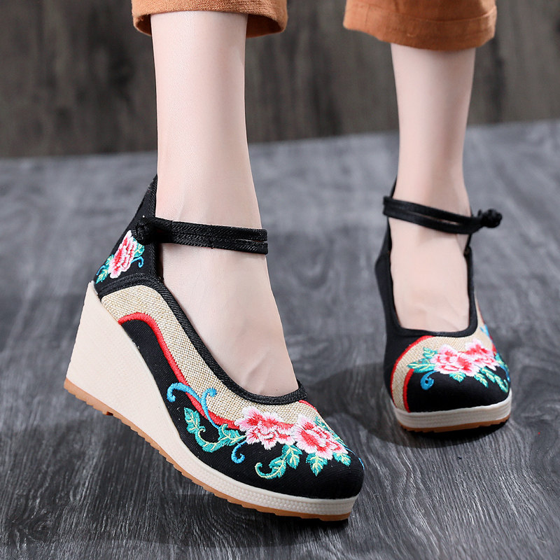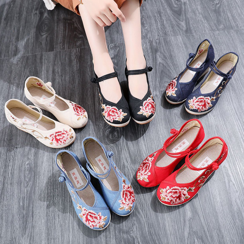 淘盘扣汉服鞋子女春夏老北京布鞋增高绣花鞋低跟民族风茶艺师工作鞋