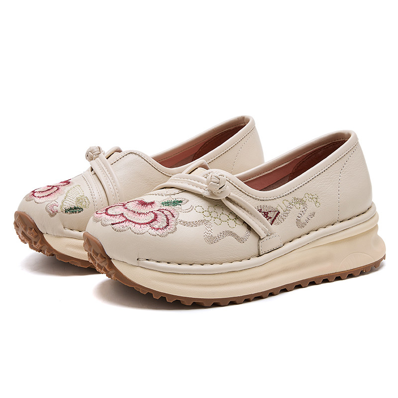 淘宝嫔妃丽人头层牛皮民族风绣花坡跟厚底防滑复古盘扣低帮休闲女单鞋