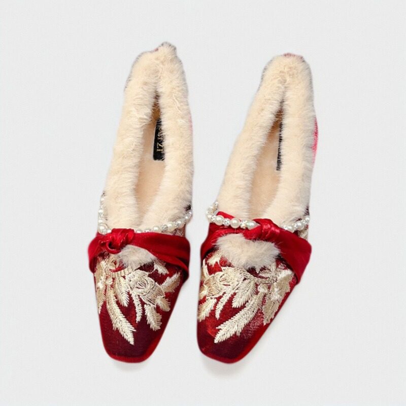 2025秋冬新款优雅缎面加绒毛毛单鞋,专为新娘打造,融合中式美学与现代舒适。精选高级缎面材质,触感柔滑,光泽典雅,鞋面精致刺绣花鸟或吉祥纹样,寓意美好姻缘。内里加绒设计,保暖亲肤,适合秋冬婚礼场合。鞋头点缀柔软绒毛,增添温婉气质,红色主调喜庆吉祥,完美搭配秀禾服或敬酒礼服。3-5cm舒适跟高,行走稳健,兼顾美观与实用。无论是接亲、敬酒还是婚宴仪式,这款婚鞋都能让您在重要时刻尽显东方新娘的端庄与柔美,成为全场焦点。