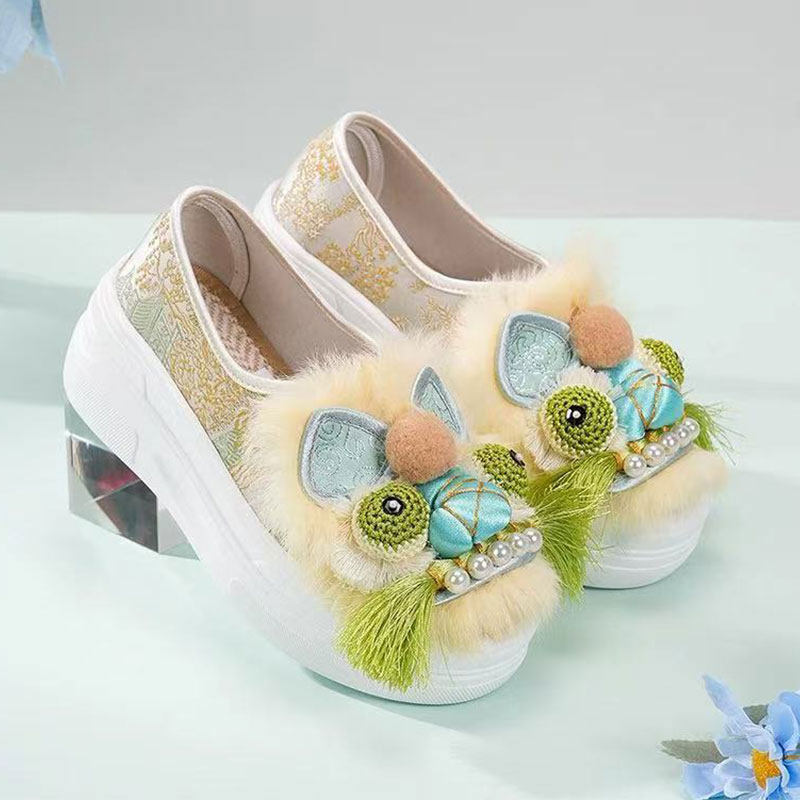 淘2024新款走绣坊国潮绣花复古风官绿锦缎面料非遗老虎鞋纯手工制作