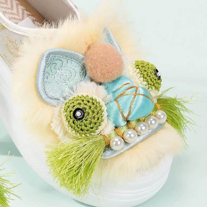 冬季加绒手工包头兔毛虎头棉拖鞋女古风保暖老北京中式绣花布拖鞋