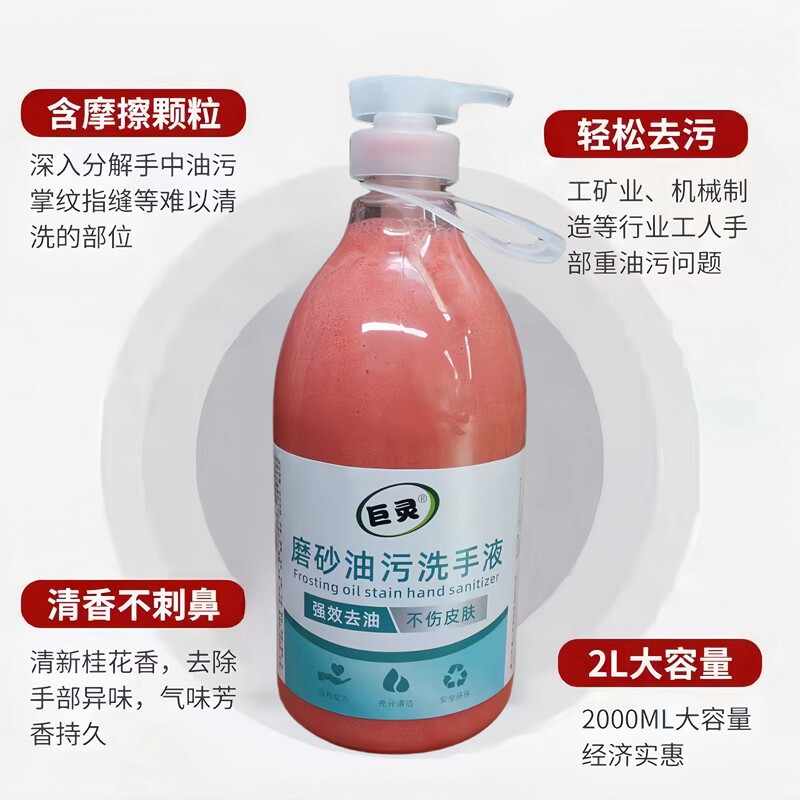 磨砂工业油污洗手液是专为汽修、机修等重油污环境设计的强力清洁产品。其独特配方融合高效表面活性剂与天然磨砂颗粒,能深入渗透并分解机油、润滑油、油漆等顽固污渍,轻松去除手部及皮肤褶皱中的重油污。膏体呈细腻沙状,兼具清洁与去角质功能,使用后双手清爽不油腻,且不含强腐蚀性成分,温和护手。适用于汽修厂、机械厂、维修车间等场所,是机修工人、汽修师傅的必备清洁用品。快速去油、高效洁净,让重油污一洗而净,守护双手健康。