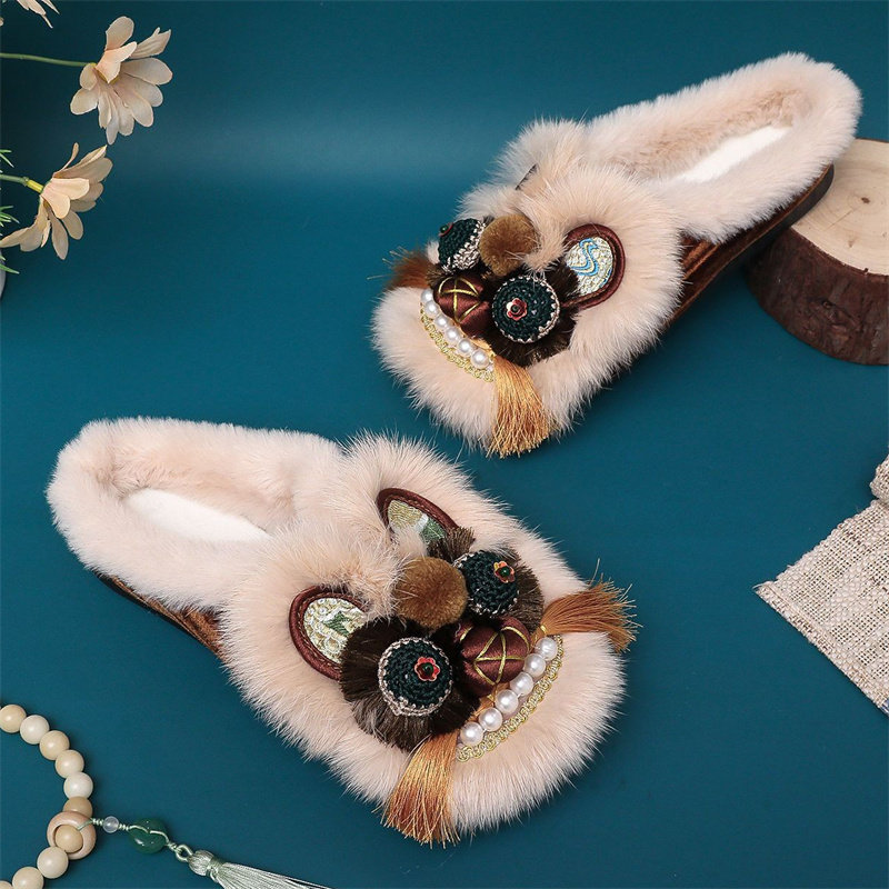 这款冬季加绒手工包头兔毛虎头棉拖鞋,融合传统中式美学与现代保暖工艺,专为女性设计。采用优质兔毛包边,触感柔软,保暖性极佳;内里加厚加绒,锁温舒适,适合寒冷季节居家穿着。鞋面为老北京风格中式绣花布,配以寓意吉祥的虎头造型,既显童趣又具古典韵味,彰显东方雅致。手工缝制,针脚细密,结实耐穿。包头设计有效保护脚部,防滑鞋底安全贴心。整体兼具保暖性、舒适性与艺术美感,是冬日里兼具实用与品位的居家良品,展现温婉古韵与现代生活的完美融合。