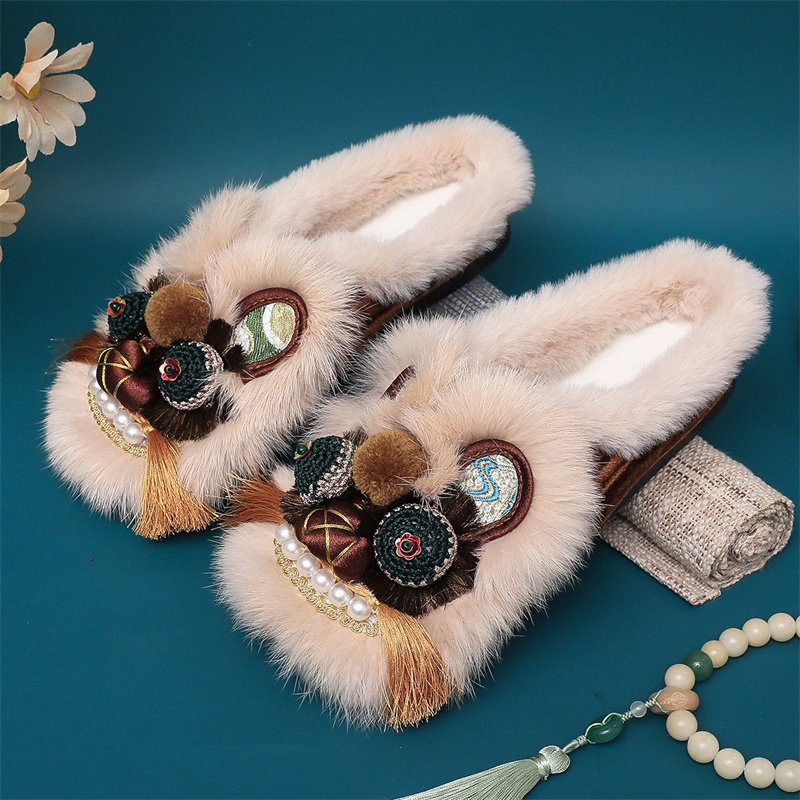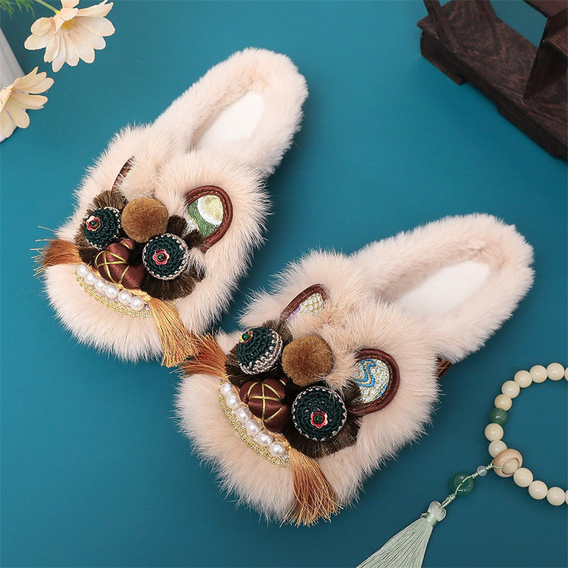 淘宝冬季加绒手工包头兔毛虎头棉拖鞋女古风保暖老北京中式绣花布拖鞋