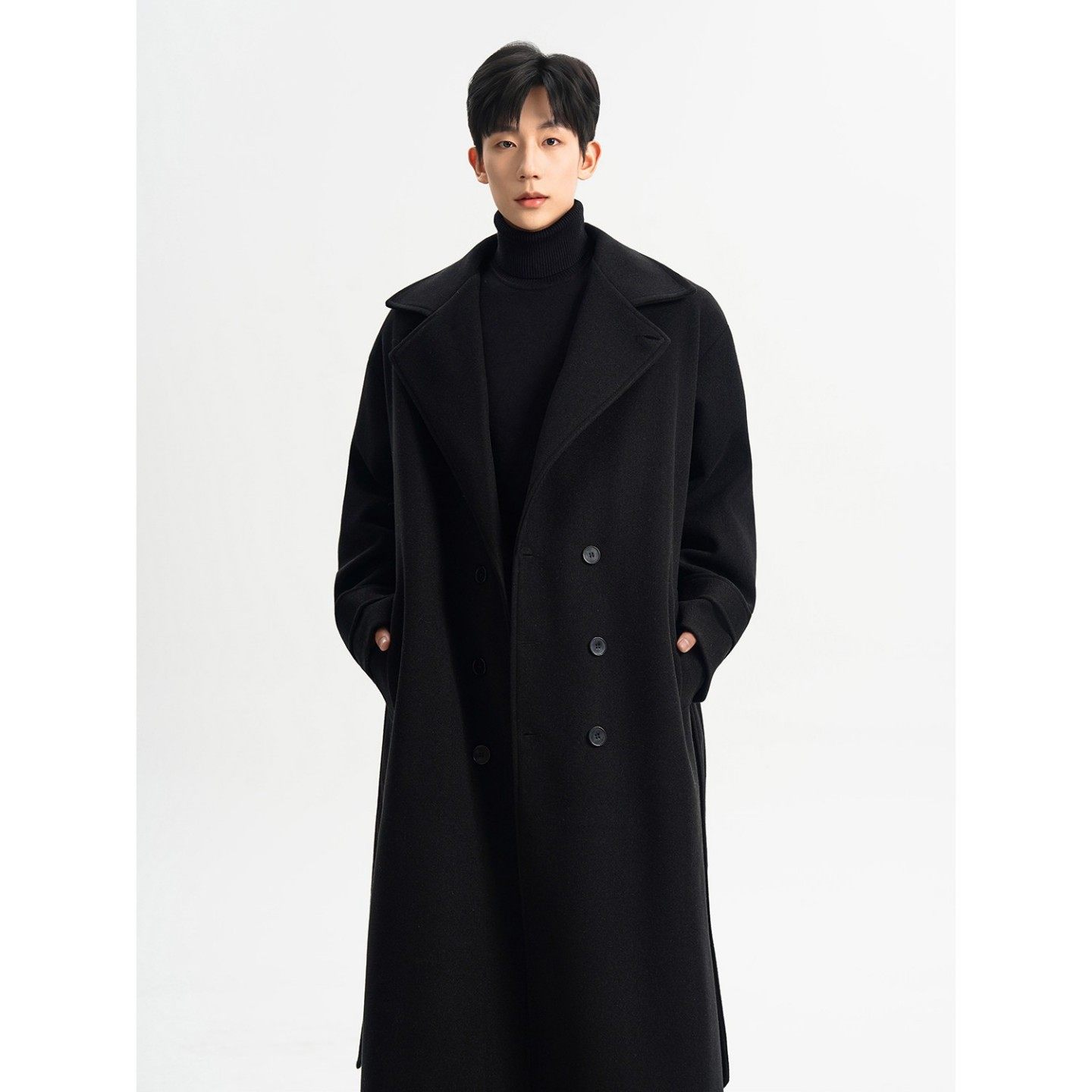 天猫黑色立领毛呢外套男冬季长款过膝教父大衣英伦雅痞高级感呢子风衣