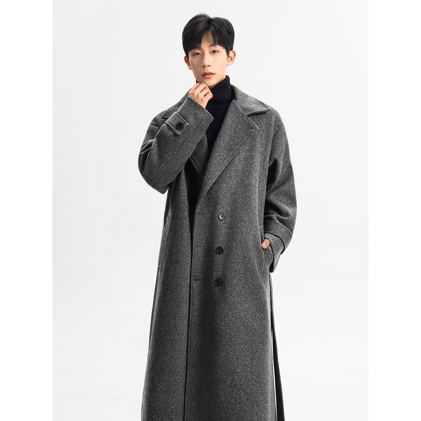 淘男生垫肩大衣韩版高端中长款2025秋冬季新款黑色毛呢风衣加厚外套