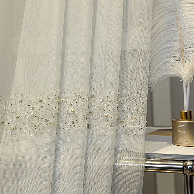 外贸窗纱挂钩式绣花叶子纱帘透光滤光飘逸白色田园阳台客厅落地窗