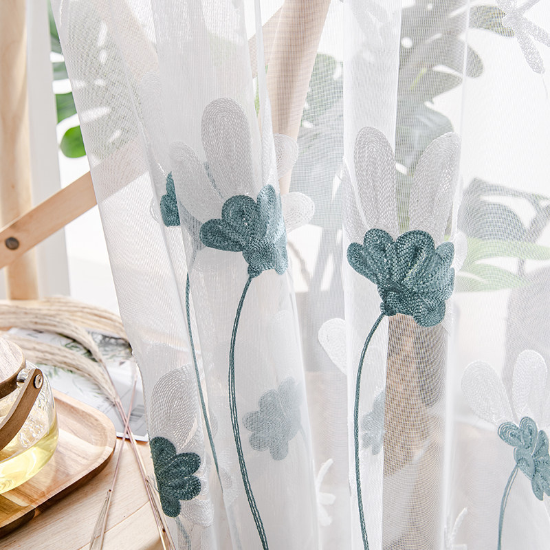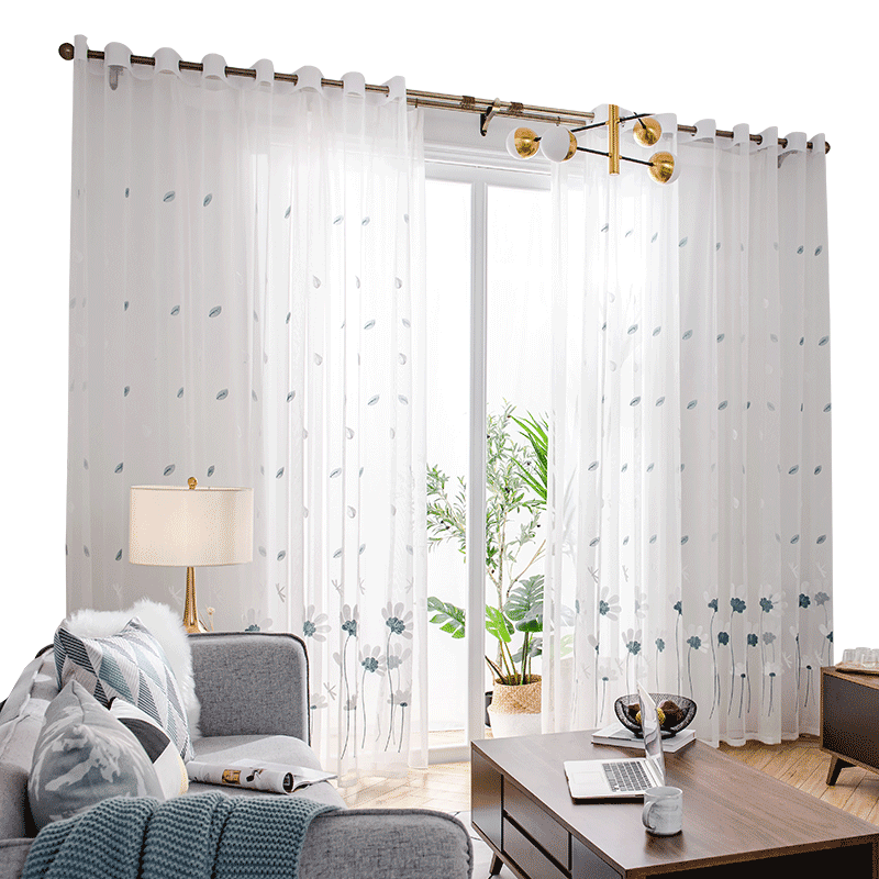 淘外贸窗纱挂钩式绣花叶子纱帘透光滤光飘逸白色田园阳台客厅落地窗