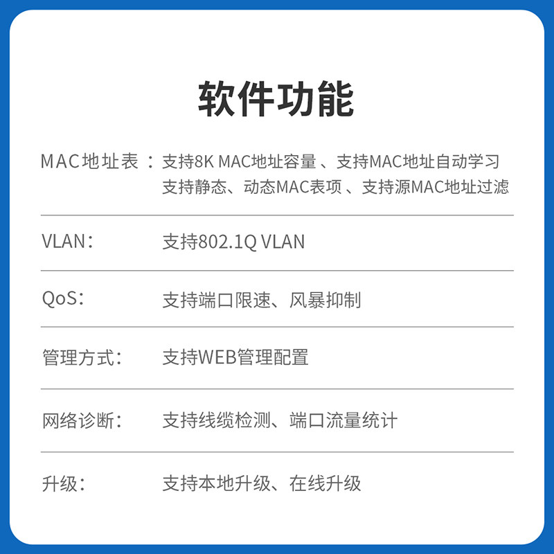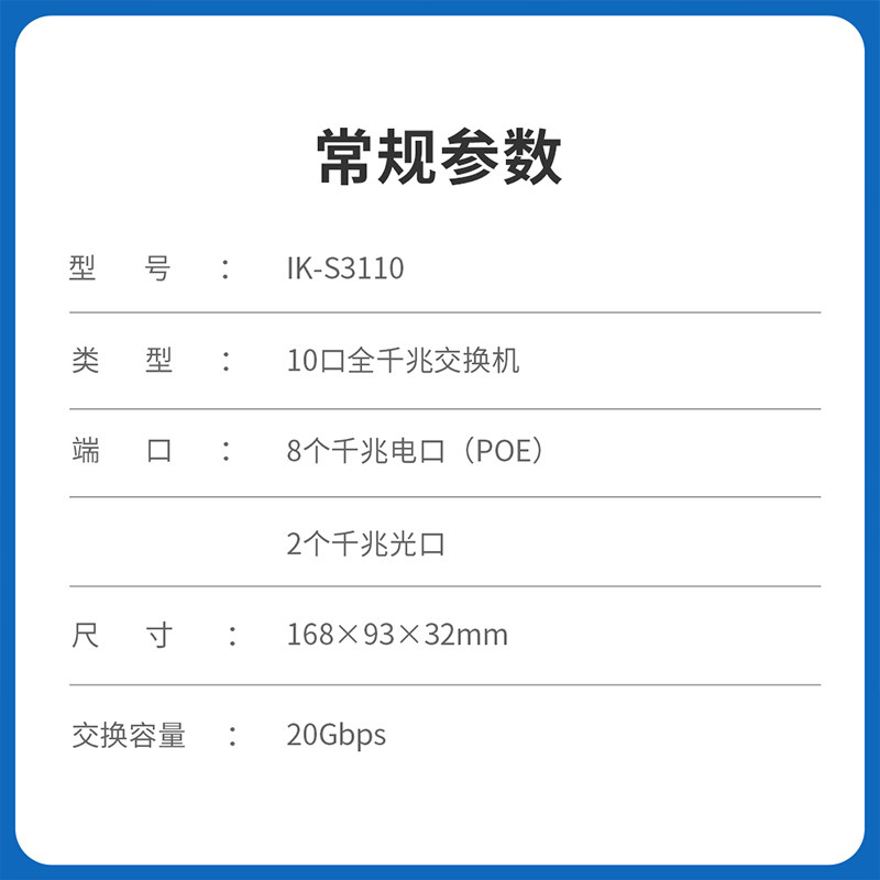 【顺丰包邮】爱快(iKuai)IK-S3110是一款专为中小企业及商用场景设计的10口全千兆POE交换机。采用坚固金属外壳,具备良好的散热性与抗干扰能力,稳定耐用。支持8个千兆POE供电端口和2个千兆上行端口,单端口最大输出功率达30W,总功率150W,可轻松为IP摄像头、无线AP、VoIP电话等设备供电,简化布线。即插即用,无需复杂配置,非网管型设计操作简便,适合家庭办公、商铺、小型办公室等环境。支持IEEE 802.3af/at标准,智能识别供电设备,安全可靠。顺丰包邮,售后无忧,是构建高效稳定网络的理想选择。