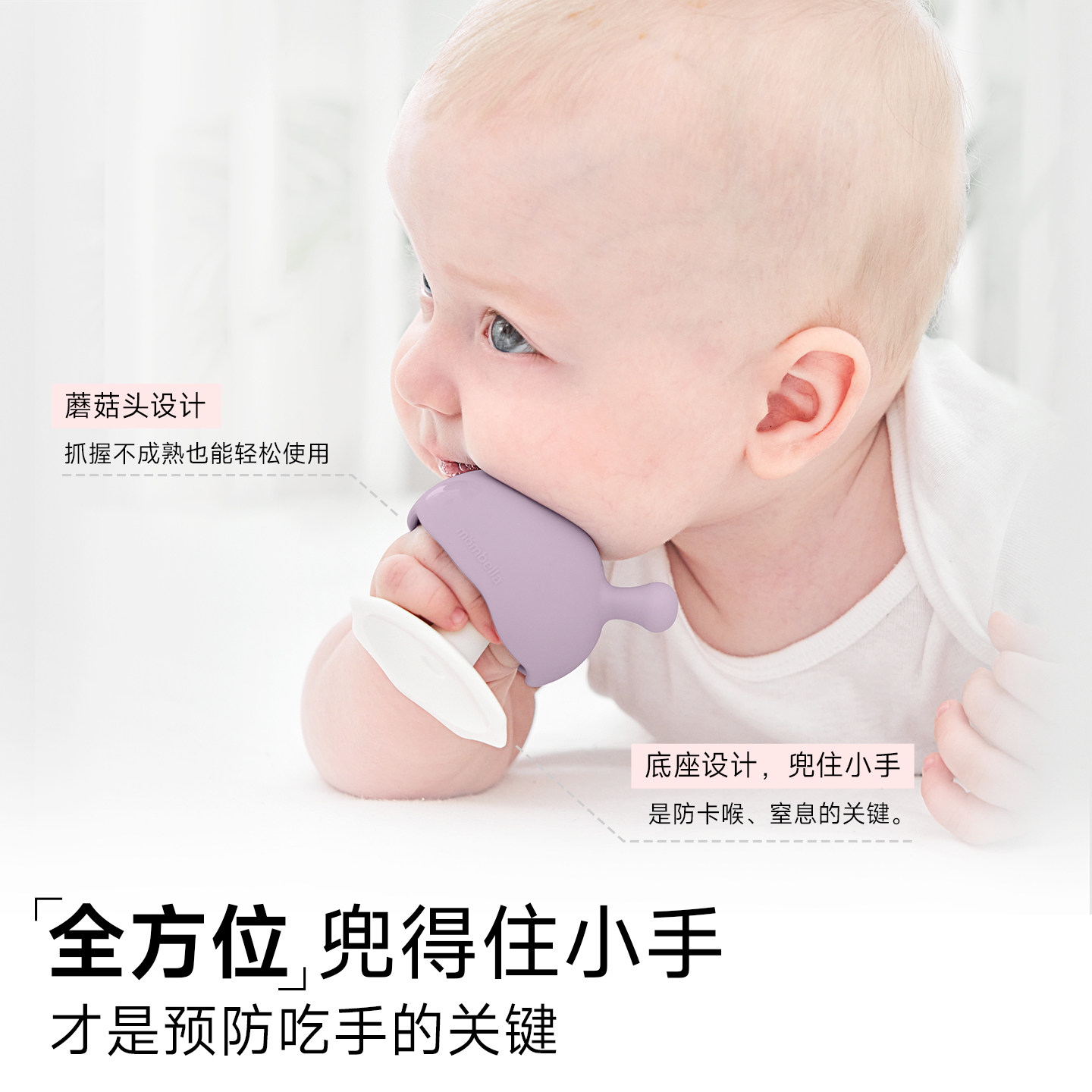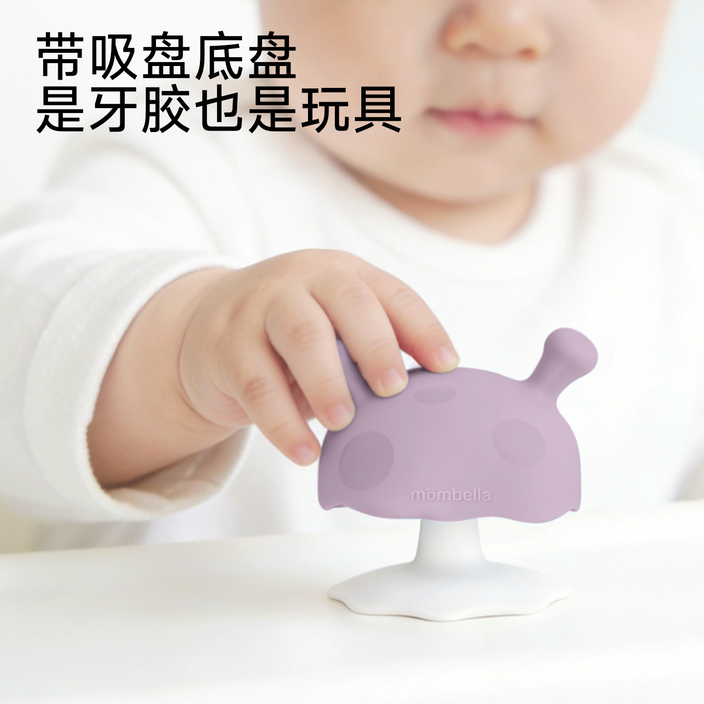 Mombella小蘑菇安抚牙胶是一款专为婴儿设计的防吃手神器和磨牙棒,造型萌趣如小蘑菇,深受宝宝喜爱。采用食品级液态硅胶材质,安全无毒、柔软耐咬,有效缓解宝宝出牙期牙龈不适。独特的手指套设计,可套在妈妈手指上引导宝宝正确吮吸,帮助戒除吃手习惯。产品支持全件水煮消毒,耐高温达200℃,清洁便捷更安心。圆润边缘贴合宝宝口腔,不伤牙龈,适合3个月以上宝宝使用。既是安抚神器,又是早教玩具,助力宝宝健康成长,是新手爸妈的贴心之选。