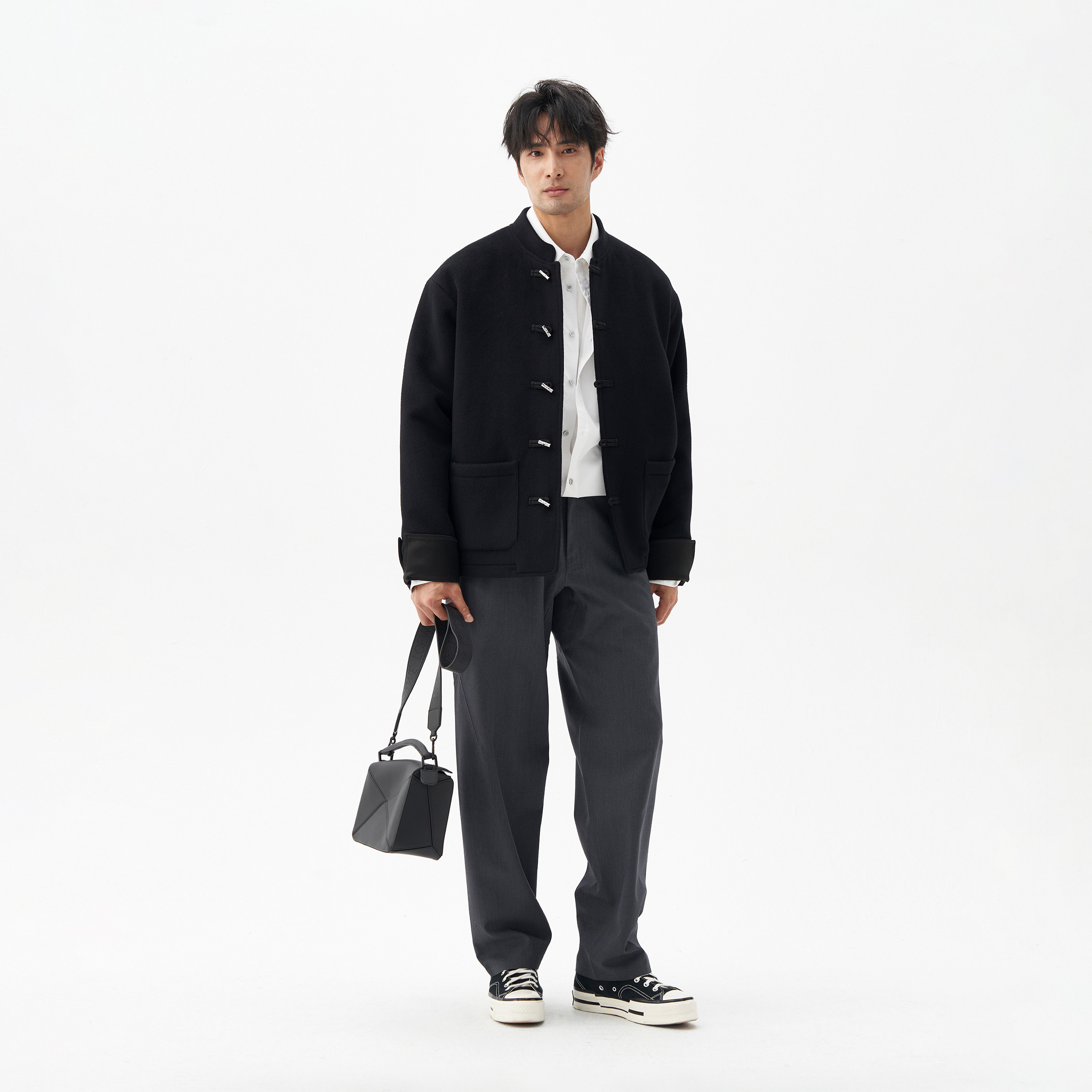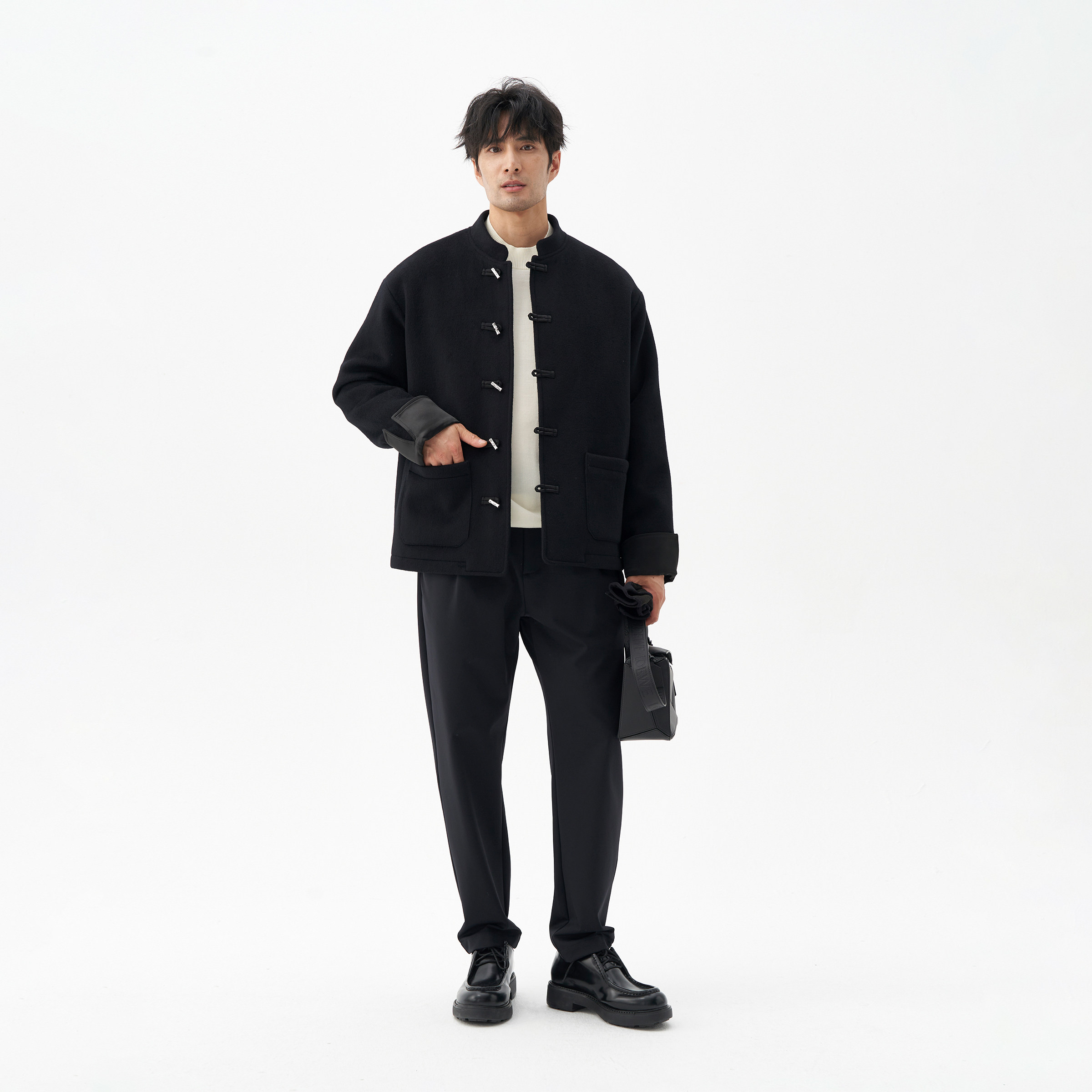 LEZORA山羊绒拼缎面三醋酸金属竹节扣立领新中式羊绒大衣,融合传统东方美学与现代剪裁工艺。精选优质山羊绒与光泽感缎面三醋酸面料拼接,质感细腻,垂坠挺括,兼具保暖与优雅。立领设计配以金属竹节扣点缀,灵感源自中式古典元素,彰显低调奢华与文化韵味。整体廓形利落修身,兼顾舒适与风度,适合商务、休闲等多种场合。细节处匠心独运,如手工缝线与精致包边,体现高端品质。这款大衣不仅是对传统服饰的现代诠释,更是都市男性追求品位与内涵的理想之选,诠释新中式时尚的独特魅力。