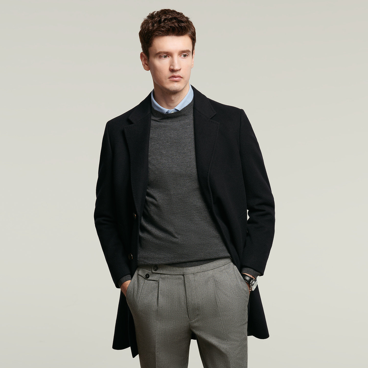 JODOLL乔顿【100%纯羊绒】大衣,专为追求品质与舒适的现代男士打造。采用优质纯羊绒面料,触感细腻柔软,轻盈保暖,即使在严寒冬季也能提供卓越的御寒体验。中长款设计简约大气,纯色风格百搭易穿,完美契合商务与休闲场合。立体剪裁彰显身形线条,细节做工精致考究,袖口、门襟等部位注重实用与美观并重。内衬顺滑,穿着舒适无束缚感。无论是搭配正装还是日常穿搭,都能展现低调优雅的绅士风范。JODOLL乔顿以匠心工艺诠释高端男装,是冬季衣橱中不可或缺的保暖经典单品。