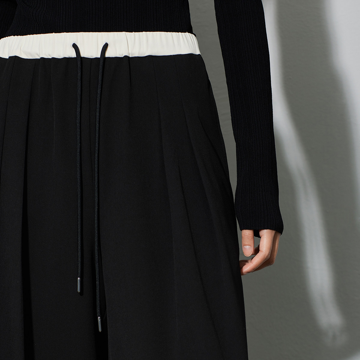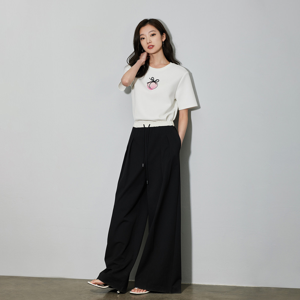 LILY 2026春新款经典通勤双褶松紧腰高腰黑色直筒阔腿休闲西裤,融合优雅与舒适,专为现代职场女性打造。高腰设计搭配精致双褶细节,巧妙修饰腰腹线条,提升整体比例;松紧腰头兼顾穿着便利与贴合感,久坐不勒。精选垂感优质面料,挺括有型,黑色经典百搭,轻松驾驭办公、会议或休闲场合。直筒阔腿剪裁行走间尽显利落气场,兼具时尚与实穿性。无论是搭配衬衫、针织衫还是西装外套,都能展现干练又不失柔美的都市风格,是春日衣橱不可或缺的通勤单品。