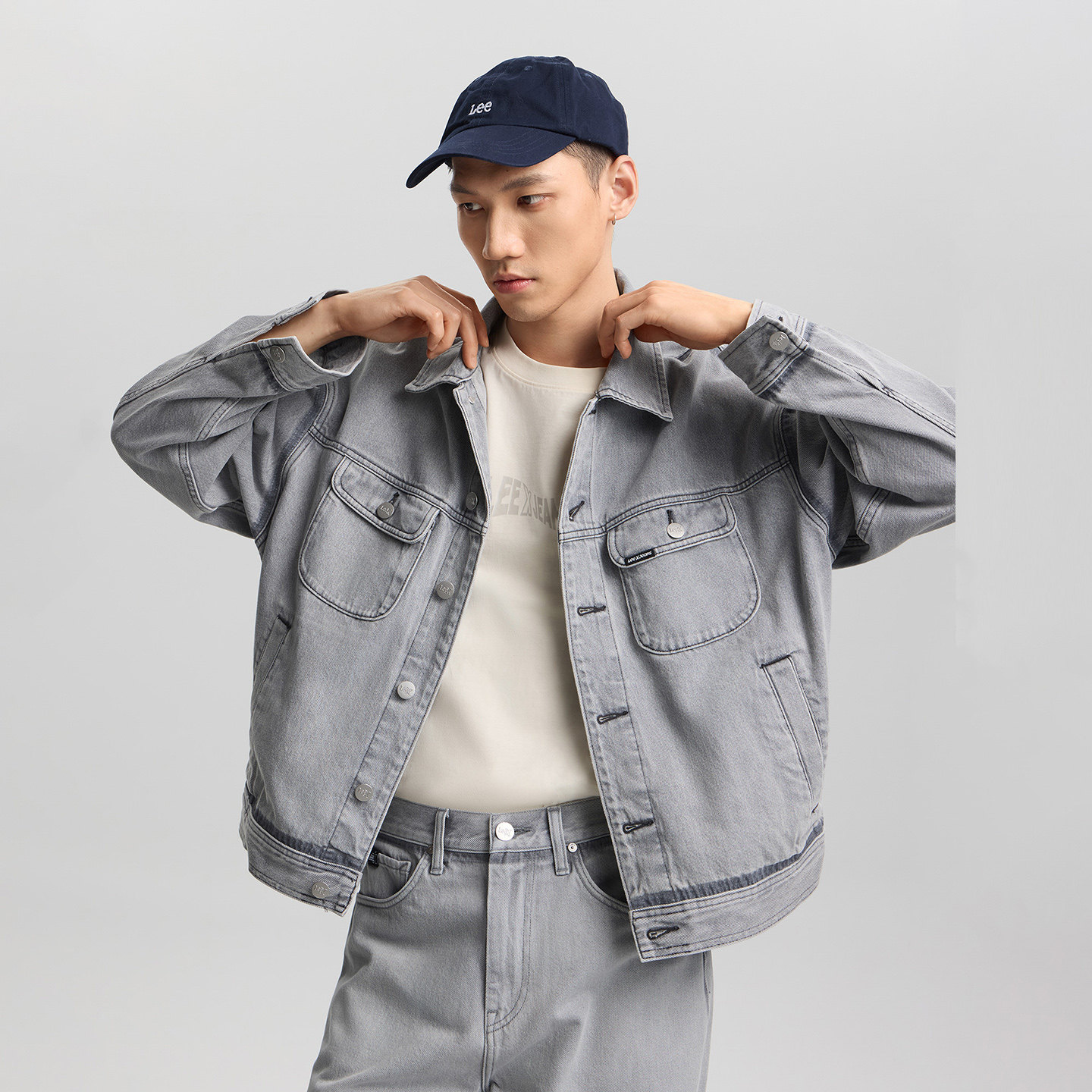 天猫Lee26春夏新品舒适版翻领浅灰色男女同款骑士牛仔夹克外套潮流