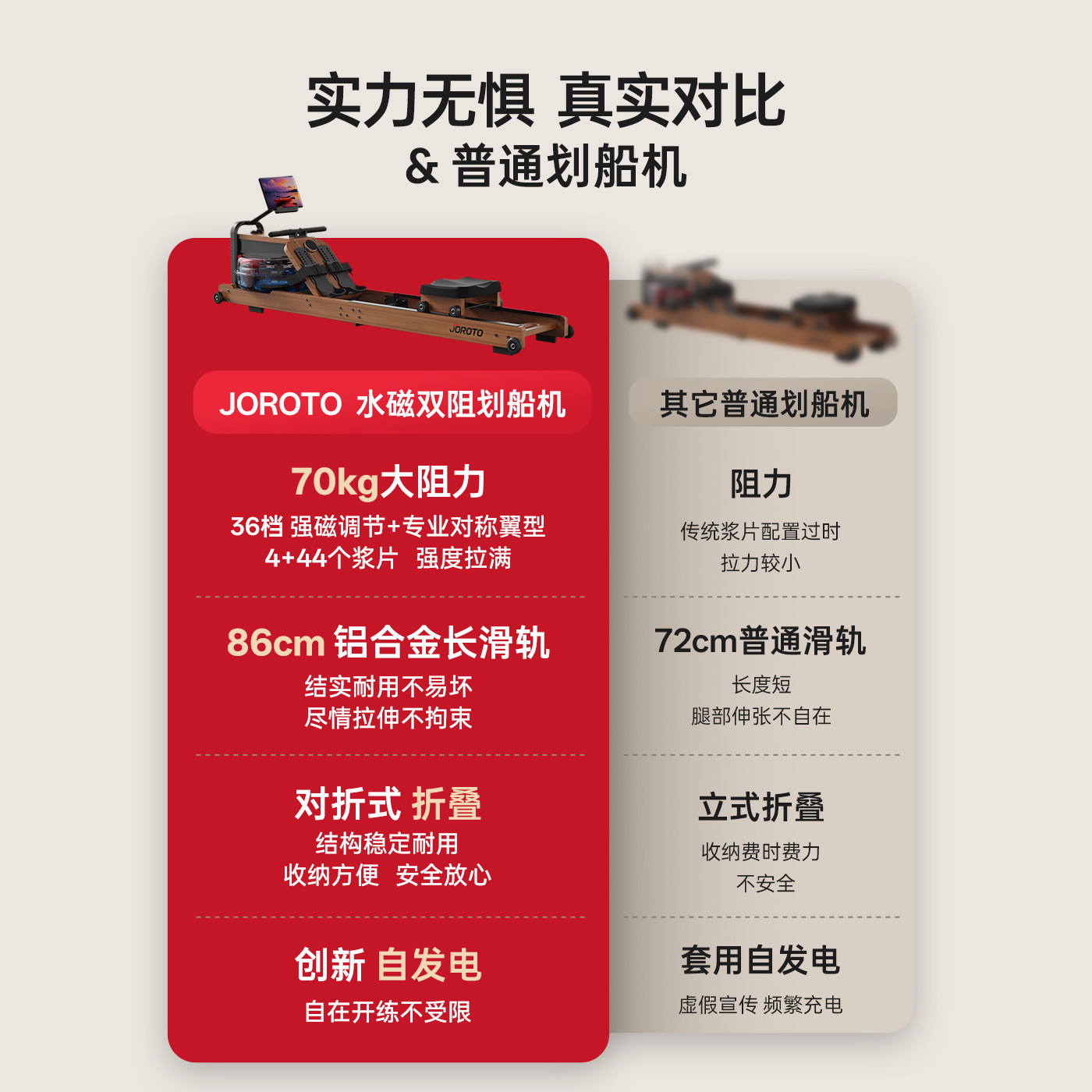 JOROTO捷瑞特MR260水磁双阻划船机是一款集科技与实用于一体的家用智能健身器材。采用创新的水磁双阻系统,既保留水阻的真实划桨感,又融入磁阻的静音与精准调节,满足不同强度训练需求。机身结构稳固,配备高回弹坐垫与防滑脚踏,保障运动安全与舒适。支持智能APP互联,实时记录划频、卡路里等数据,助力科学健身。整机可一键折叠,节省空间,适合家庭使用。无论是减脂塑形还是提升心肺功能,MR260都能提供专业级的划船体验,是现代家庭健康生活的高效之选。