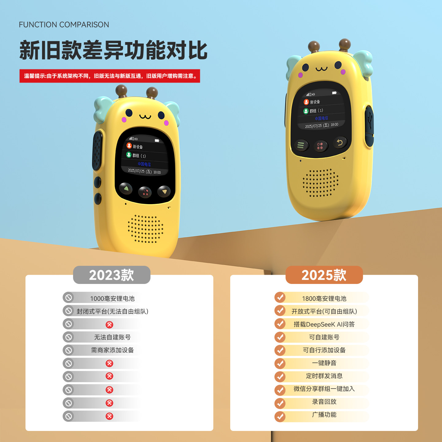 歌天2026新款儿童对讲机,专为亲子、家庭及异地情侣设计,支持超远距离无线对讲,理论通话距离可达5000公里(需配合网络中转),打破空间限制,让沟通零距离。采用高清降噪技术,声音清晰流畅,内置安全加密频道,保障隐私安全。机身轻便耐用,符合儿童人体工学设计,配备彩色显示屏与趣味按键,操作简单有趣。支持多组频道切换、语音留言、低电量提醒等功能,内置可充电锂电池,续航持久。无论是孩子户外探索、家庭出游,还是异地亲人情感维系,歌天对讲机都是贴心可靠的沟通伙伴,让爱与声音穿越千里,温暖常在。