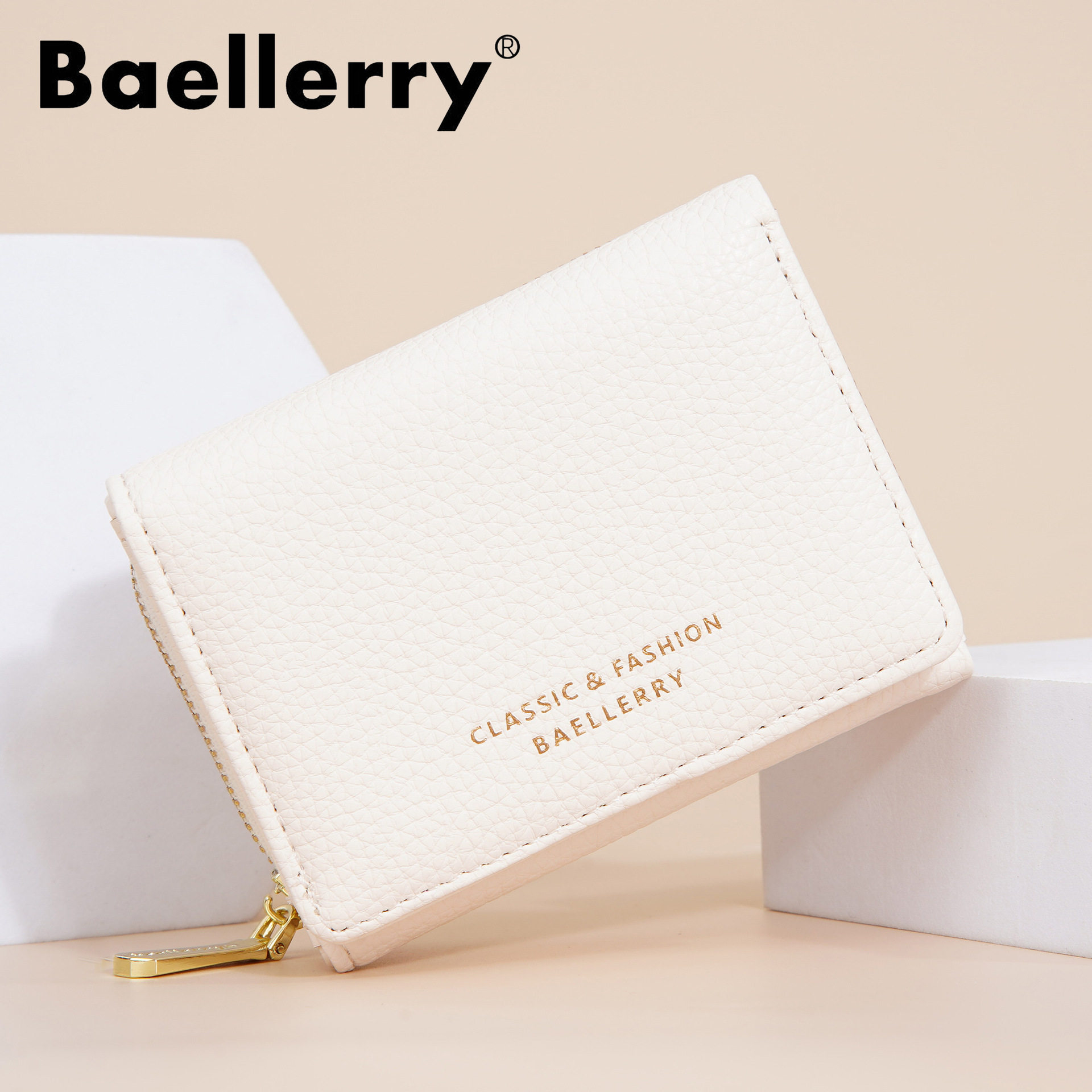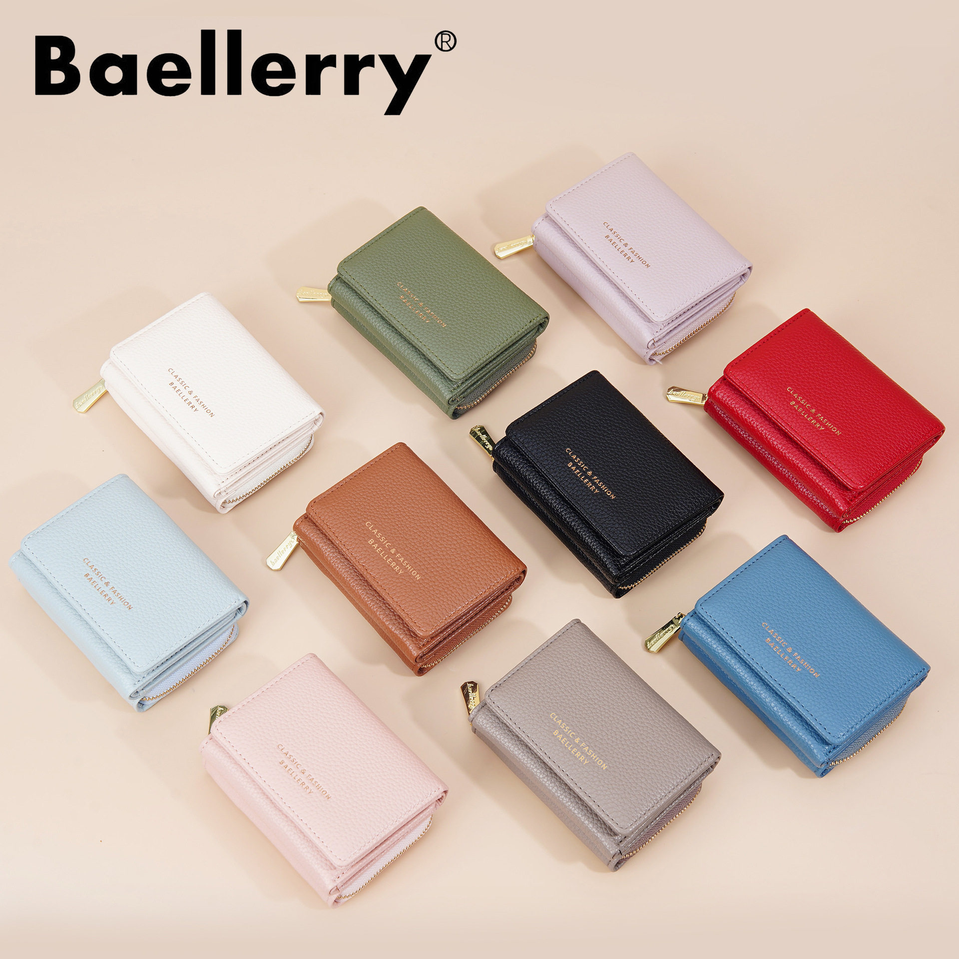 淘宝钱包女士短款 baellerry2025新款三折拉链零钱包简约荔枝纹卡包女
