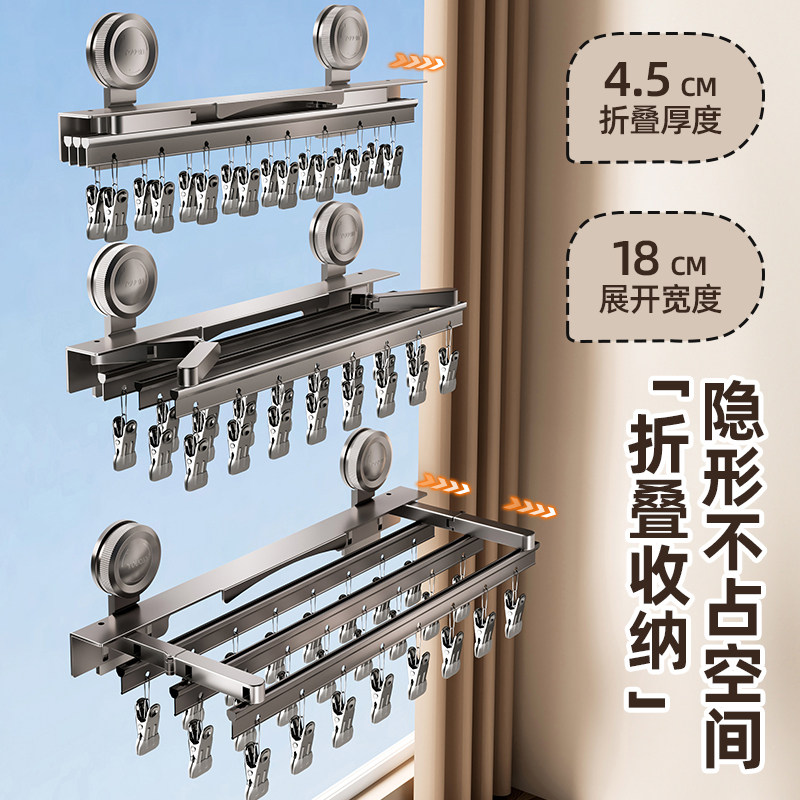 吸盘袜子架隐形折叠多夹子晾衣架多功能阳台免打孔毛巾架置物架子