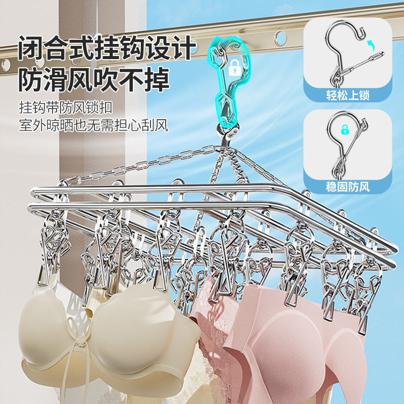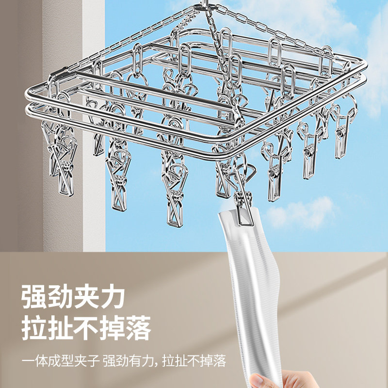 304不锈钢晾衣架多夹子多功能晒袜子可折叠防风内衣山姆款带夹子