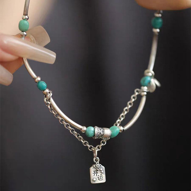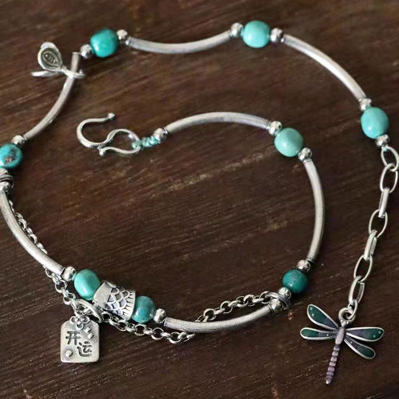淘宝925银开运绿松石脚链新中式国风小众银弯管锦鲤蜻蜓尾吊夏日脚饰