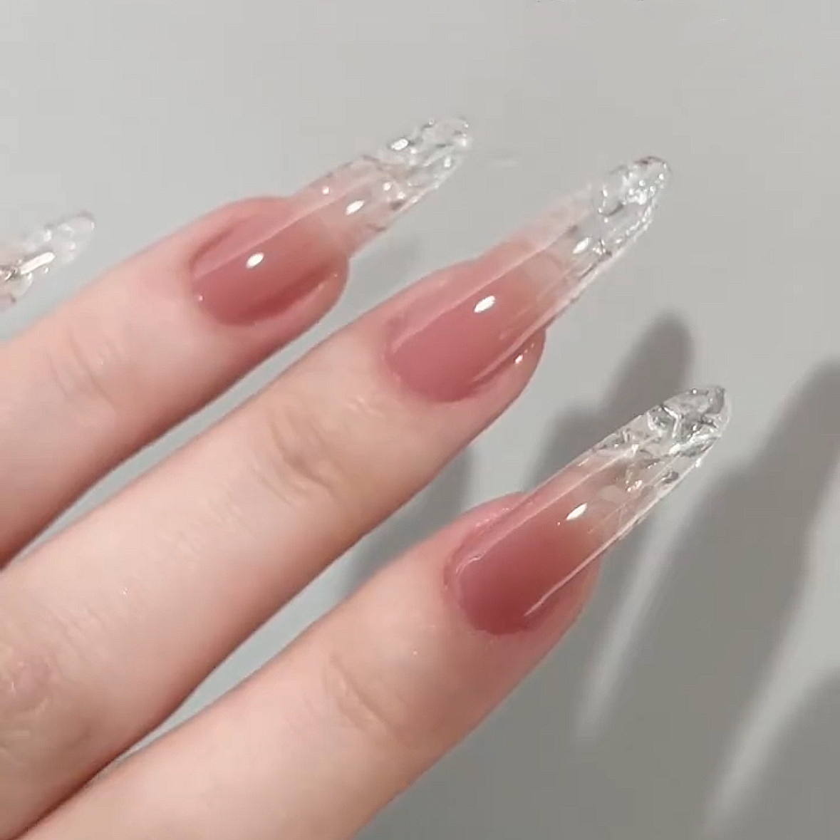 淘宝手工穿戴甲2024新款夏日冰透裸色天蓝色渐变简约琉璃脆碎玻璃美甲