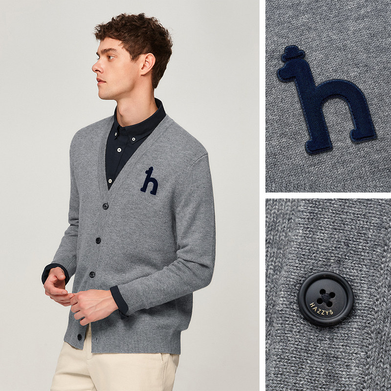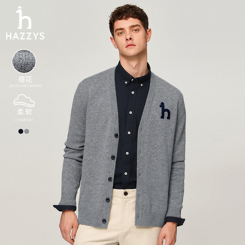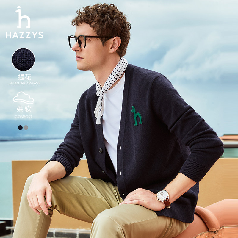 天猫【羊毛开衫】Hazzys哈吉斯秋季时尚男士休闲V领针织通勤外套毛衣