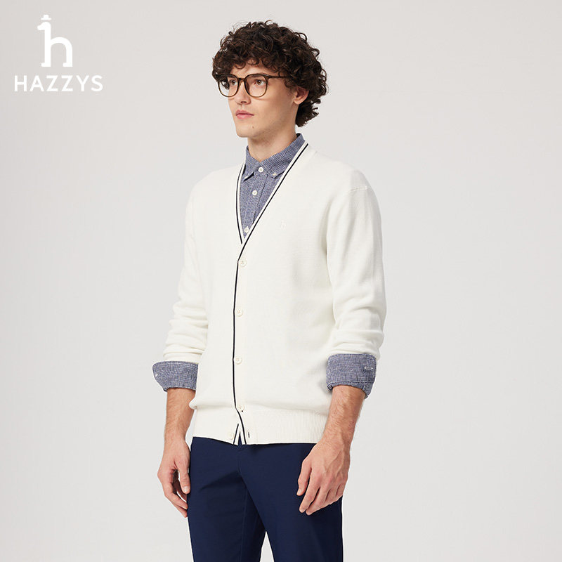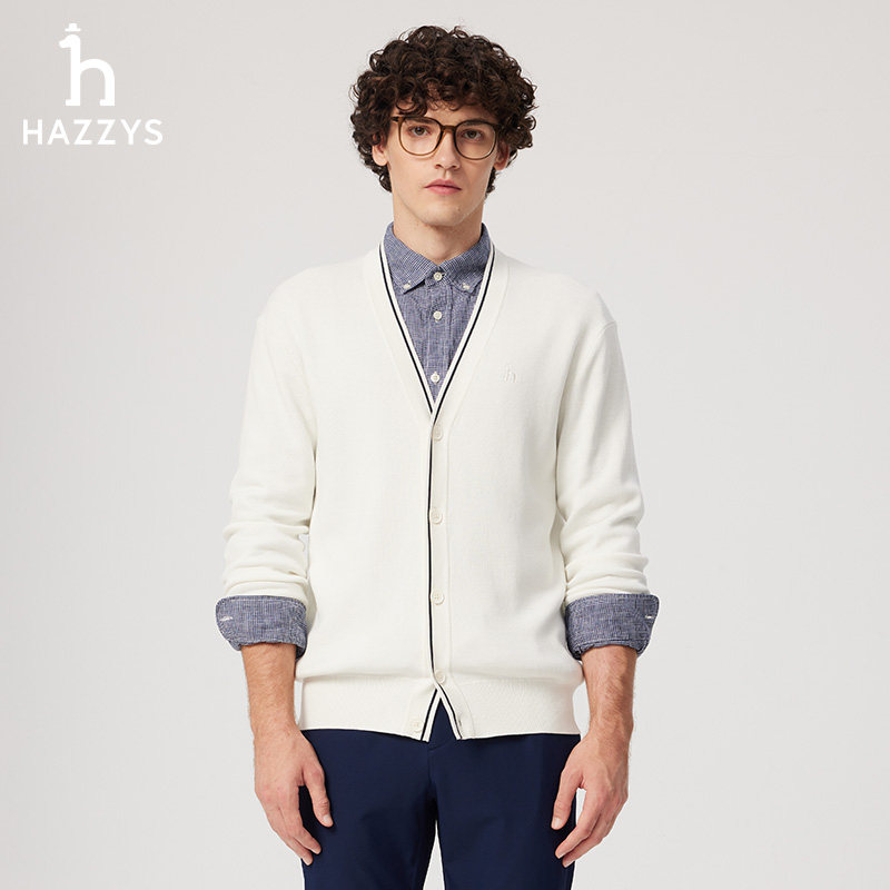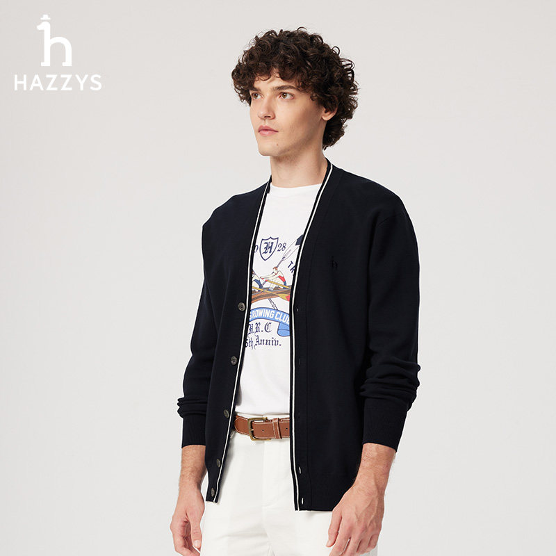 天猫Hazzys哈吉斯春夏男士纯色V领针织开衫通勤上衣纯棉休闲外套