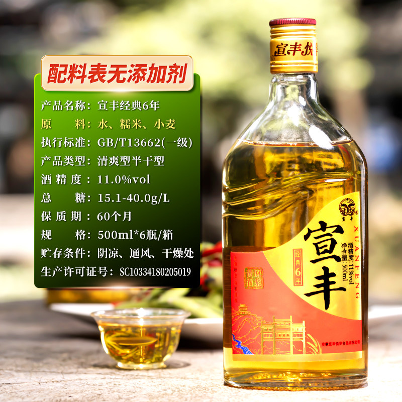 天猫宣丰黄酒无焦糖色经典6年半干型花雕酒糯米养生酒500ml*6瓶整箱装