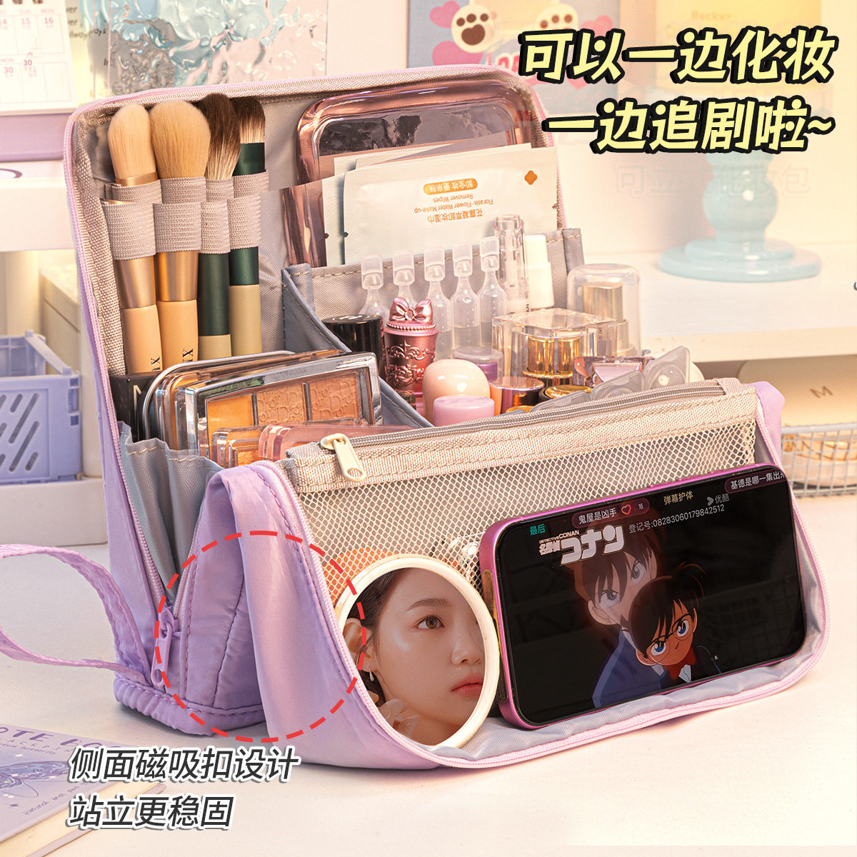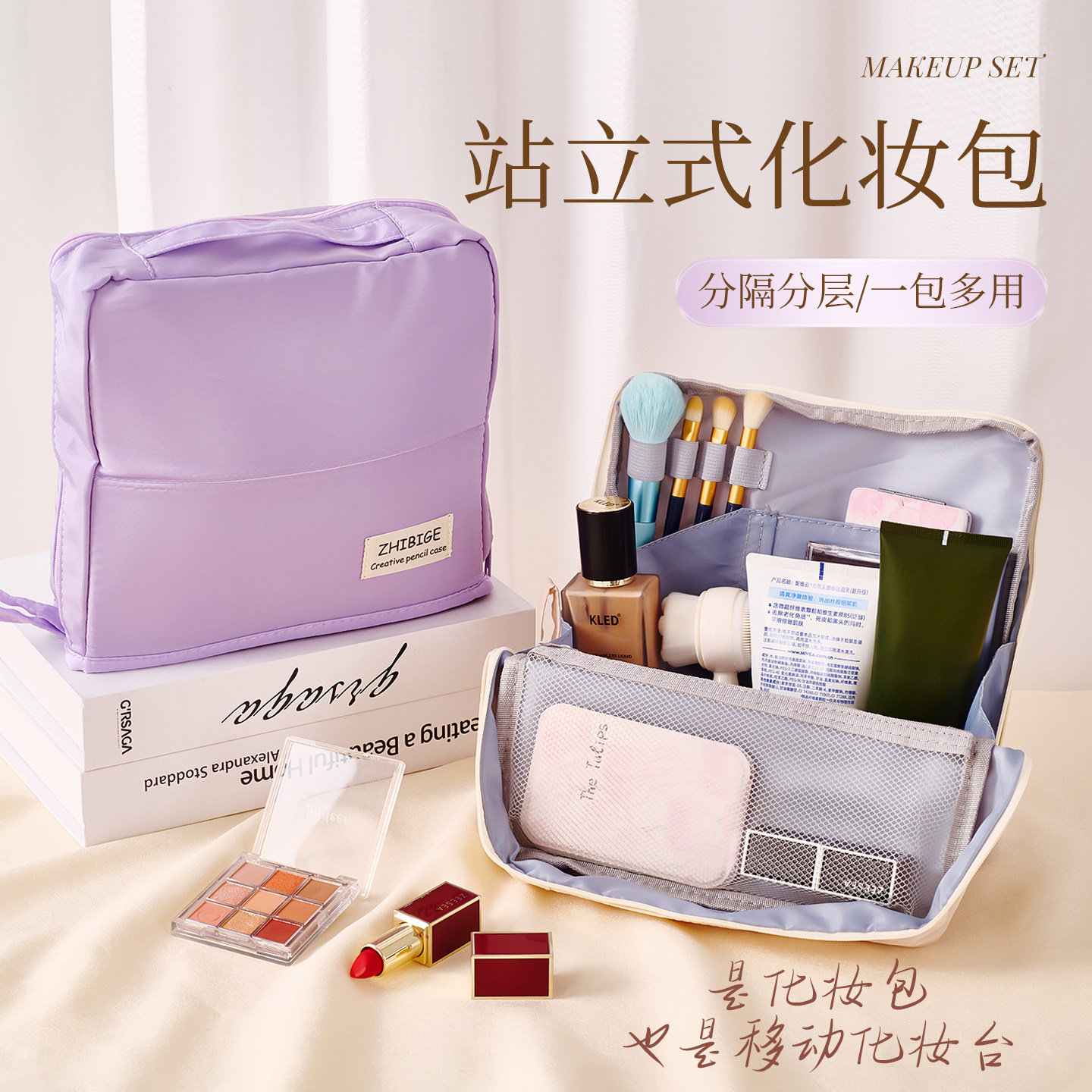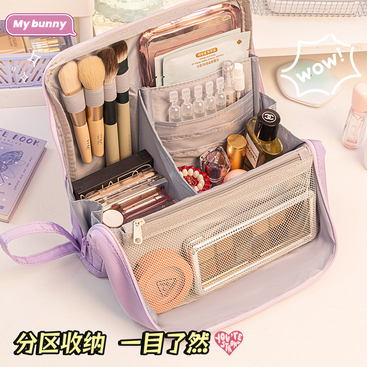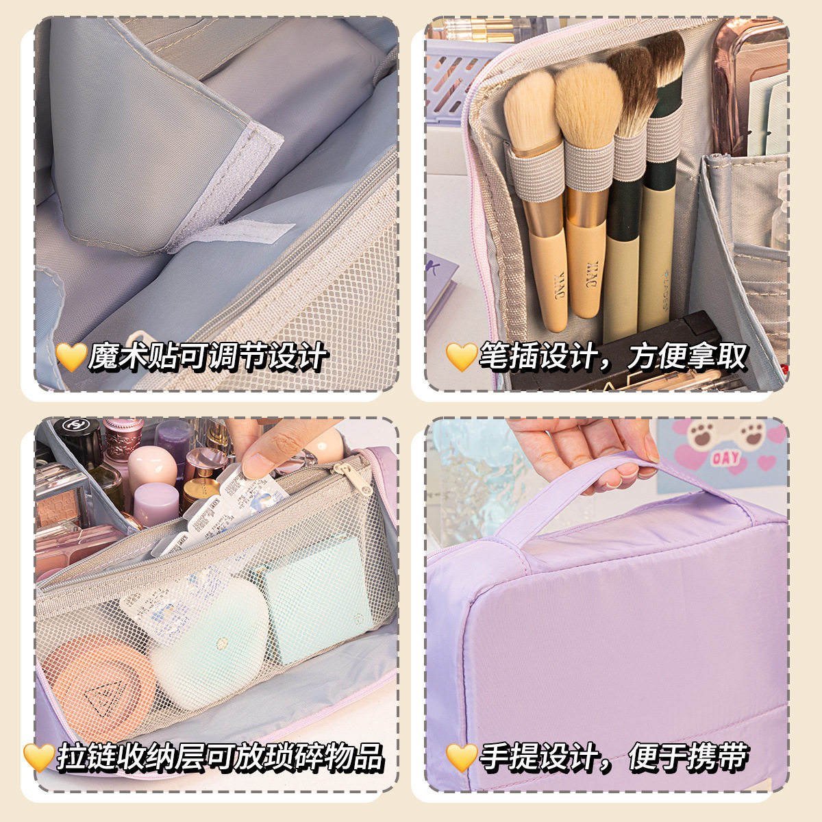 2026新款大容量女士便携式化妆包,专为现代女性外出设计,集实用与时尚于一体。采用优质防水面料,轻盈耐磨,轻松应对旅途颠簸。内部科学分区设计,设有专用化妆刷插槽、弹性固定带及多格收纳袋,可整齐收纳口红、粉底、眼影、洗漱用品等,避免碰撞串色。加厚内衬保护易碎品,拉链顺滑耐用,开合便捷。外观简约大方,多色可选,手提与挂扣双重设计,可挂于行李箱或肩背携带。无论是短途出行、差旅办公还是日常通勤,这款化妆包都能满足高效收纳需求,让美妆用品井井有条,轻松出行。