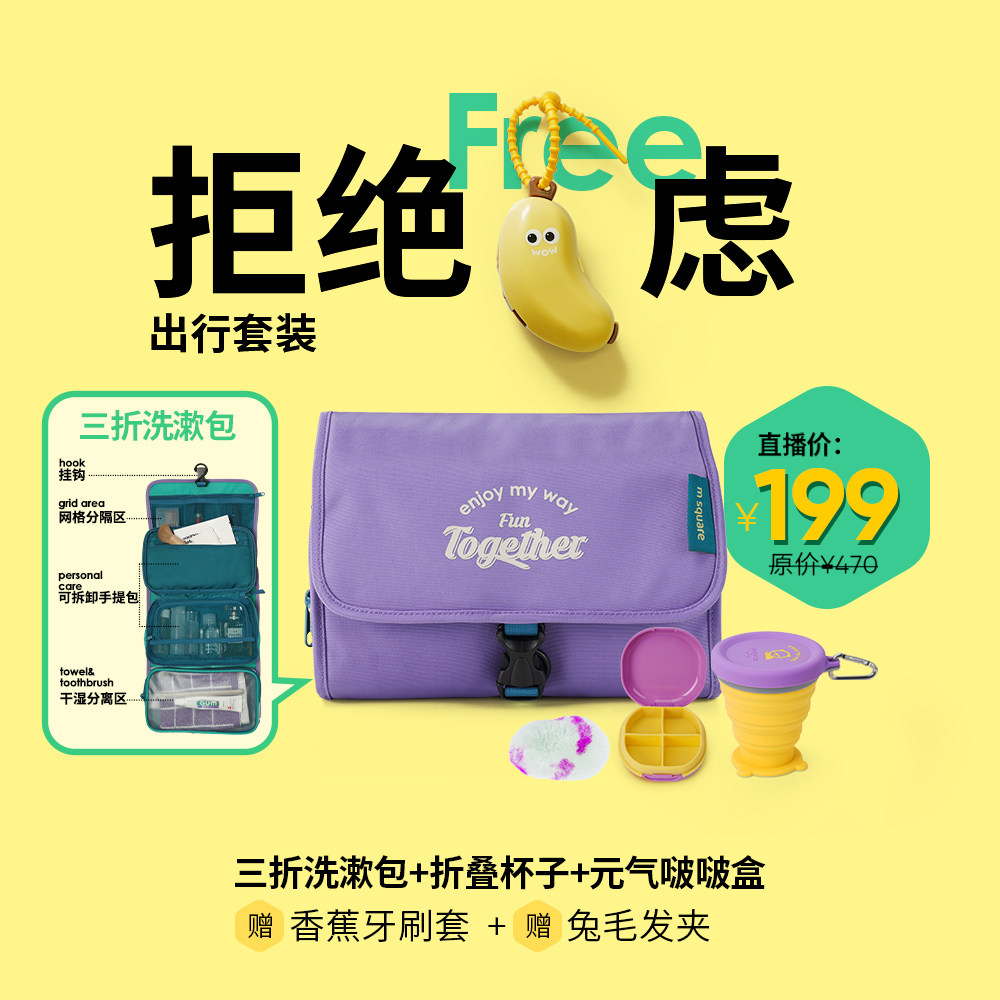【直播专享待开价】msquare旅行洗漱包,专为差旅人士设计,集实用与便携于一体。内含便携硅胶折叠杯,食品级材质安全无毒,可轻松折叠收纳,节省空间;搭配小巧收纳盒,分类存放洗漱用品、化妆品或药品,井然有序。整体采用防水面料,轻便耐用,开合顺滑,满足出行多种需求。无论是短途出行还是长途旅行,都能轻松应对。现直播间专享福利价,价格待揭晓,超值惊喜等你来抢!数量有限,先到先得,赶紧锁定直播间,把这款贴心旅行伴侣带回家!