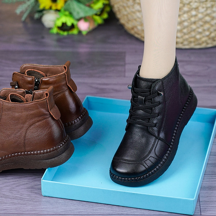 淘宝真皮平底短靴女2025秋冬新款软底软面加绒保暖棉靴舒适轻便妈妈鞋