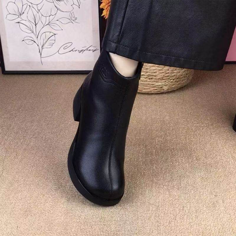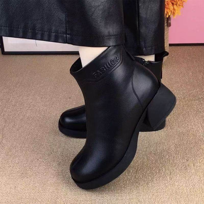 淘牛皮中年真皮短靴秋冬棉鞋粗跟舒适防滑妈妈鞋压花复古女鞋圆头