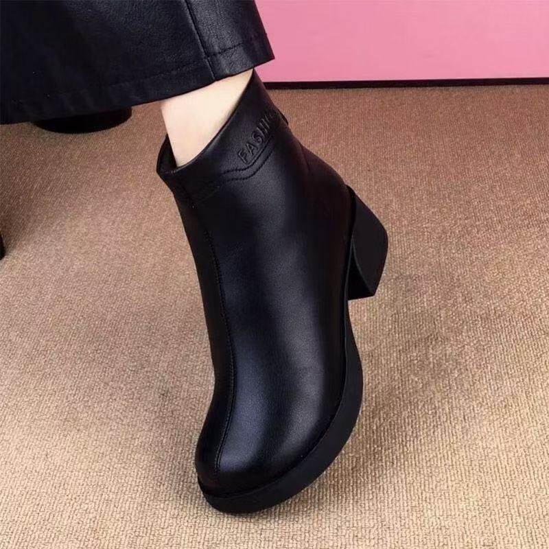 牛皮中年真皮短靴秋冬棉鞋粗跟舒适防滑妈妈鞋压花复古女鞋圆头
